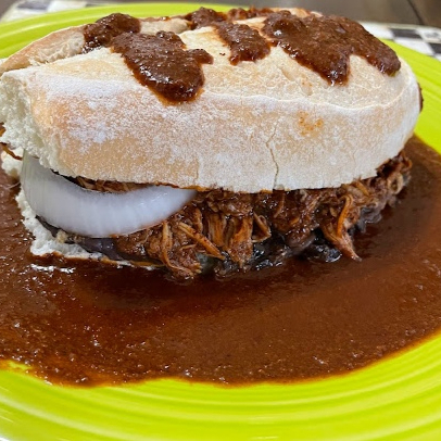 Torta deliciosa con nuestro mole poblano ancestral con pollo. Bañada al doble a su elección (se baña la torta).
