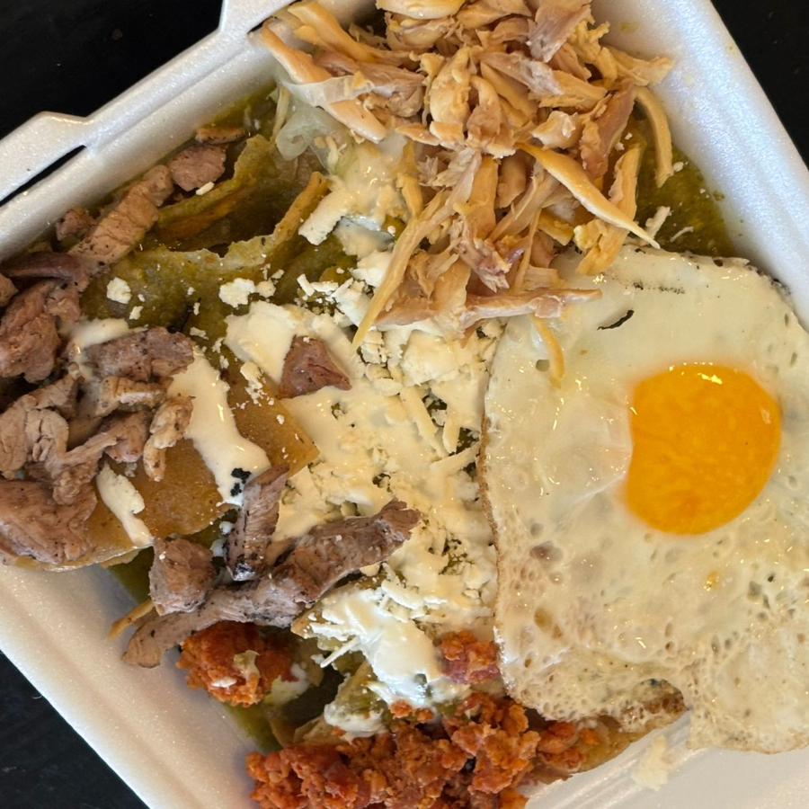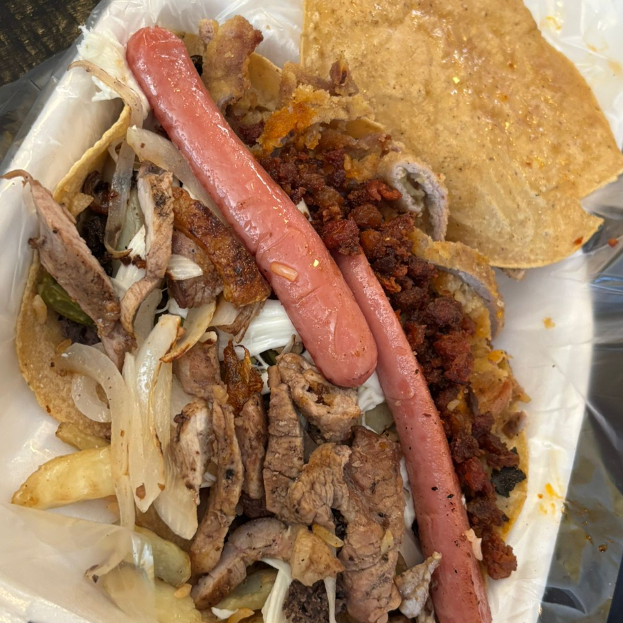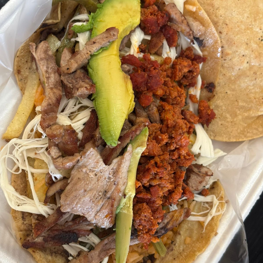 Totopo delicioso casero, salsa a su elección, bistec, pollo, longaniza, huevo, cebolla, crema, aguacate, queso y arroz.