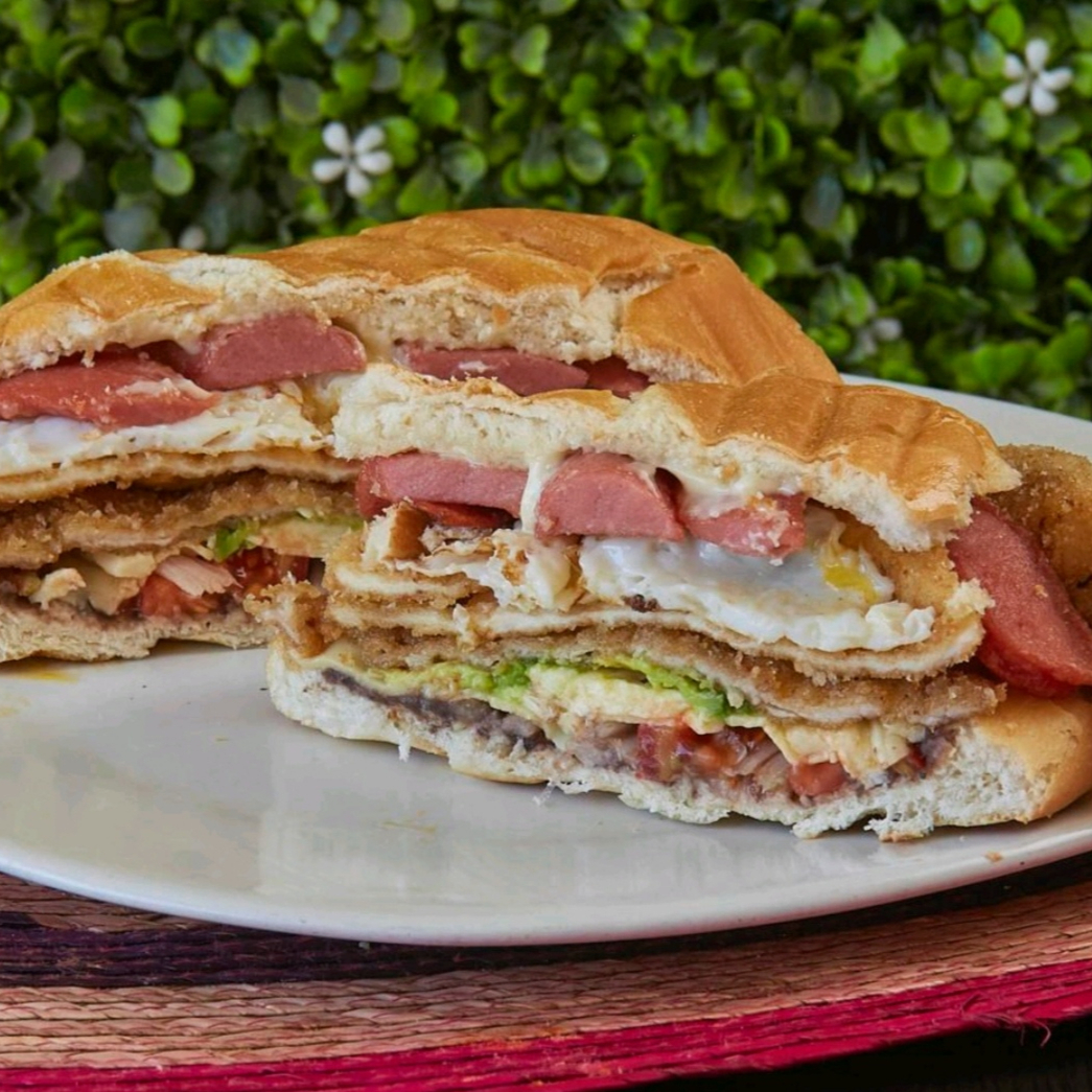 Torta deliciosa con quesillo, frijoles, mayonesa, cebolla, jitomate, aguacate, milanesa, papas, huevo, chorizo, jamón y salchicha. Picante a su elección.