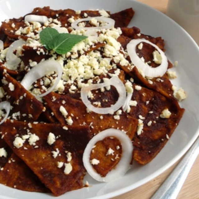 Totopo delicioso casero, mole poblano, pollo, cebolla, crema, aguacate y arroz.