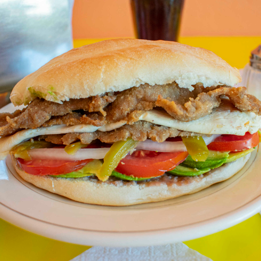 Torta deliciosa de milanesa con quesillo, frijoles, mayonesa, cebolla, jitomate, aguacate, milanesa y papas. Picante a su elección.