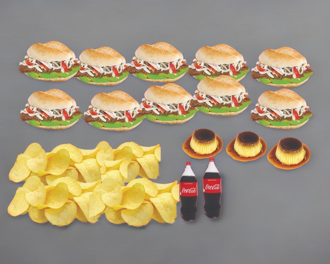 10 tortas con 2 refrescos de 2 litros, 4 ordenes de papas y 3 flanes.