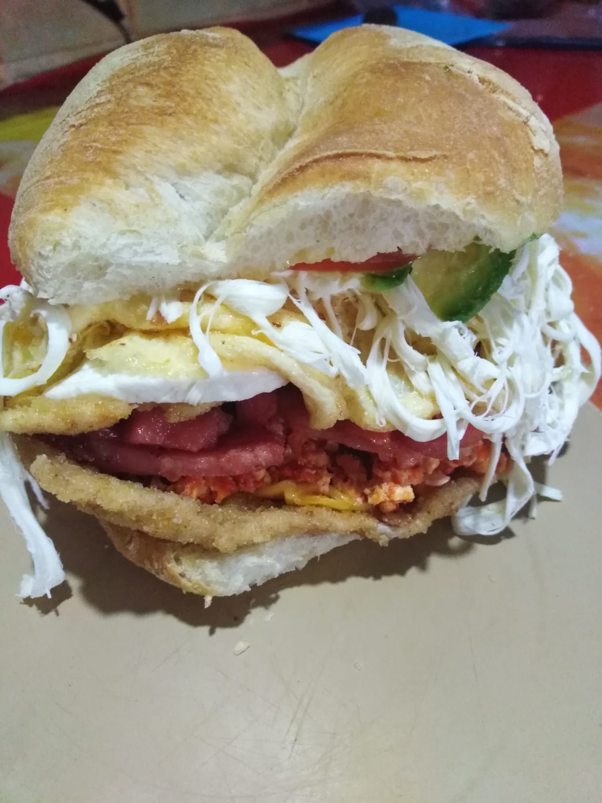 Milanesa de cerdo, huevo, mayonesa, jitomate, cebolla, aguacate, quesillo, rajas de jlapeño.