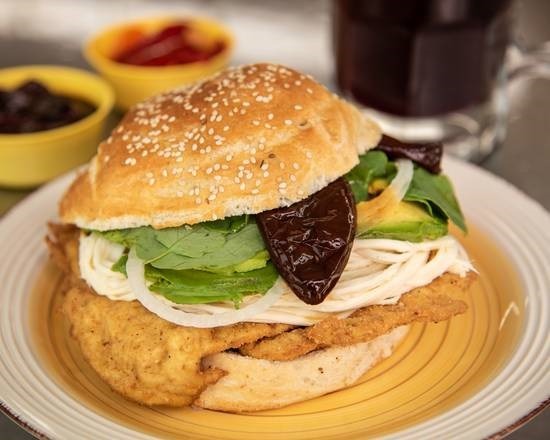 Milanesa de pollo, jamón, jitomate, cebolla, aguacate,quesillo, rajas de jalapeño.
