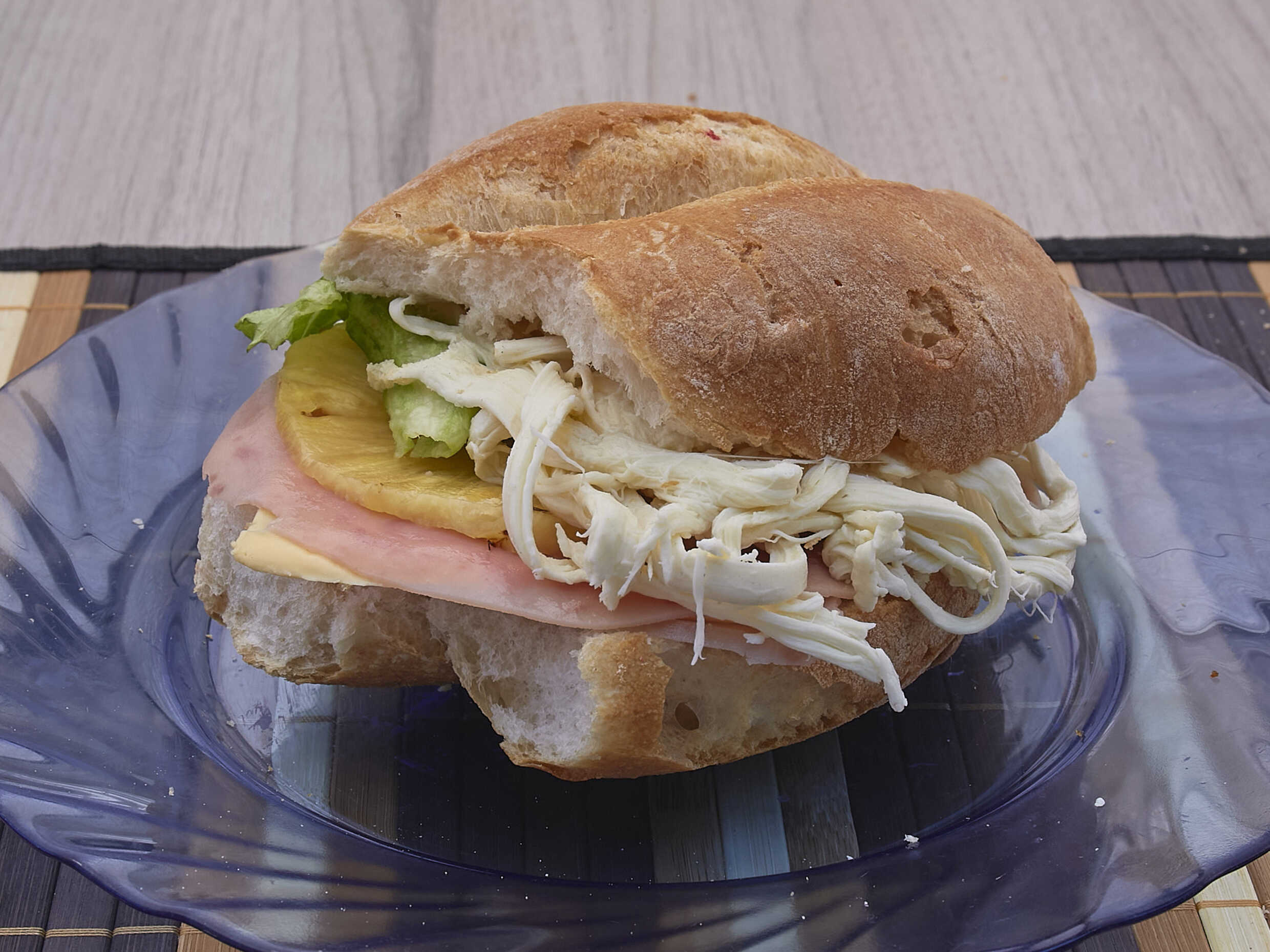 Jamón frito, queso amarillo, piña lechuga, jitomate, mayonesa y quesillo.