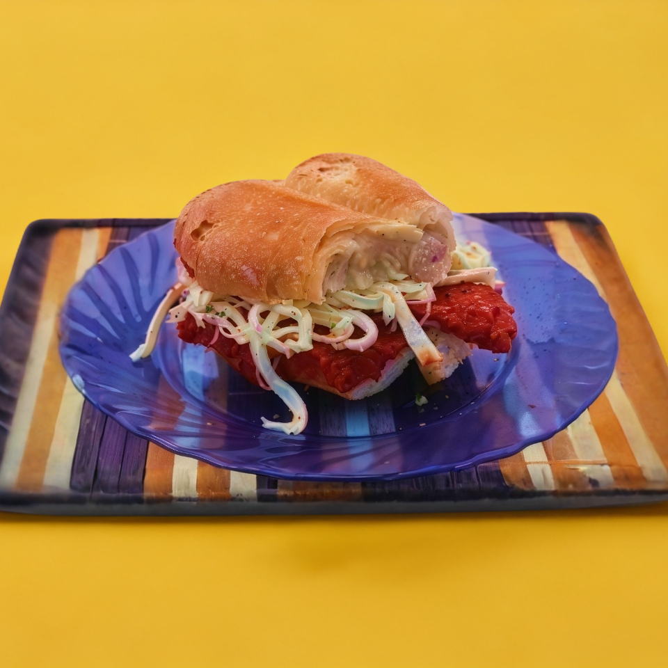 Torta de milanesa de cerdo, salchicha frita, huevo, jamón, mayonesa, jitomate, cebolla, aguacate, quesillo, rajas de jalapeño.