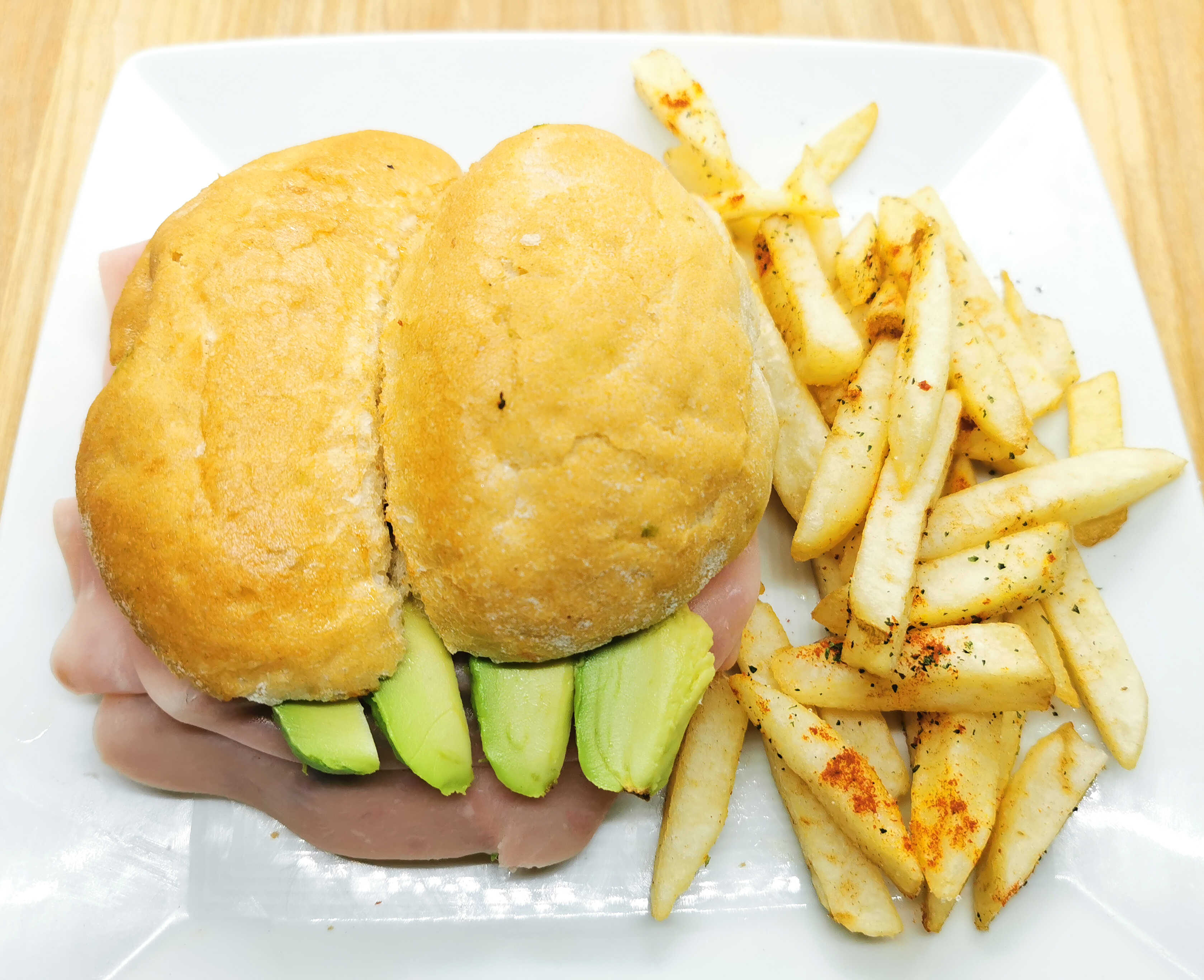 Torta de jamón con mayonesa, frijoles, quesillo, jitomate, cebolla y aguacate.