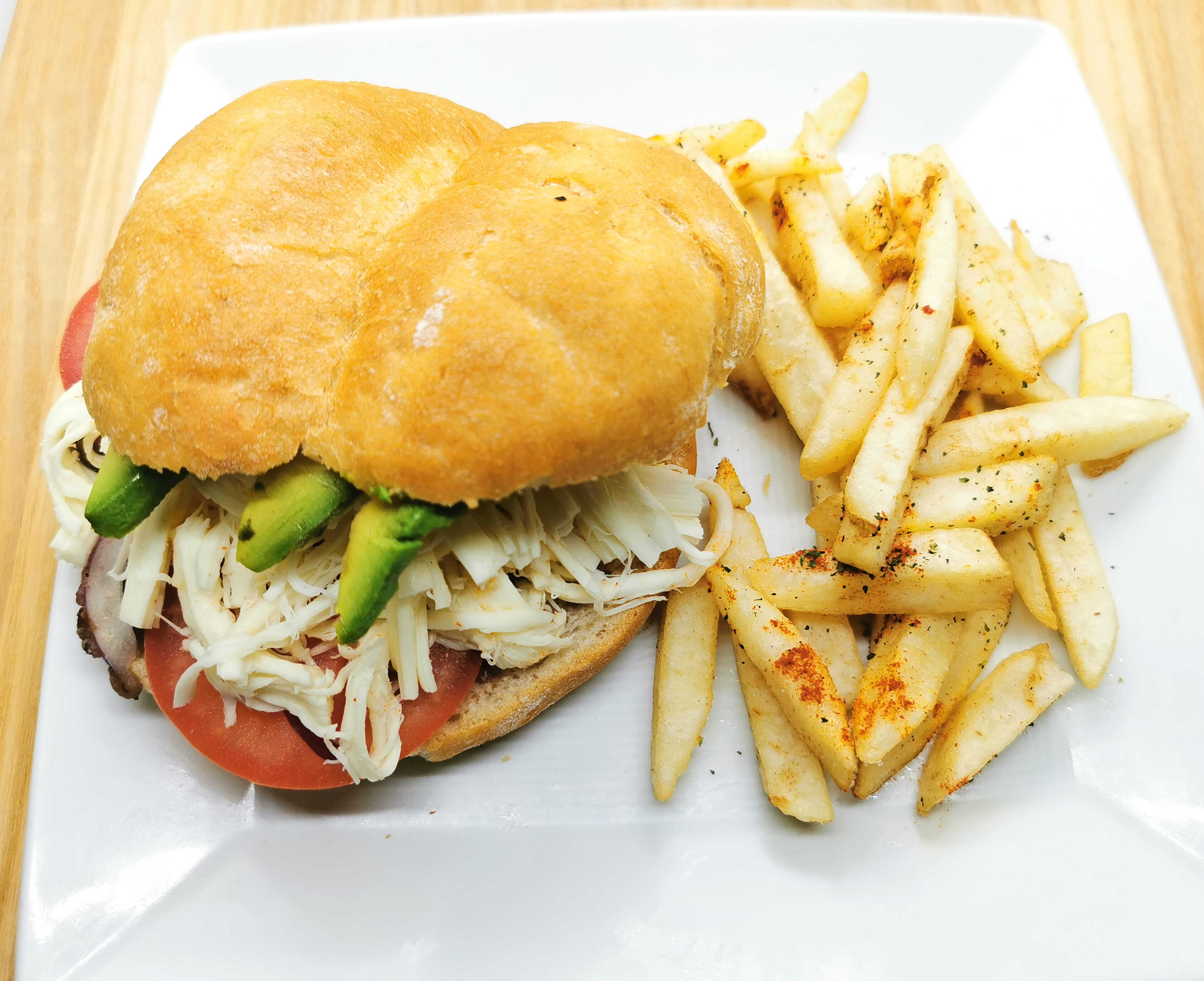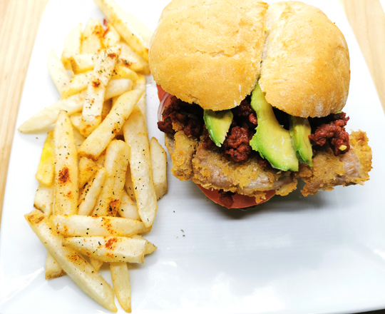 Torta de milanesa de pollo con mayonesa, frijoles, quesillo, jitomate, cebolla y aguacate.