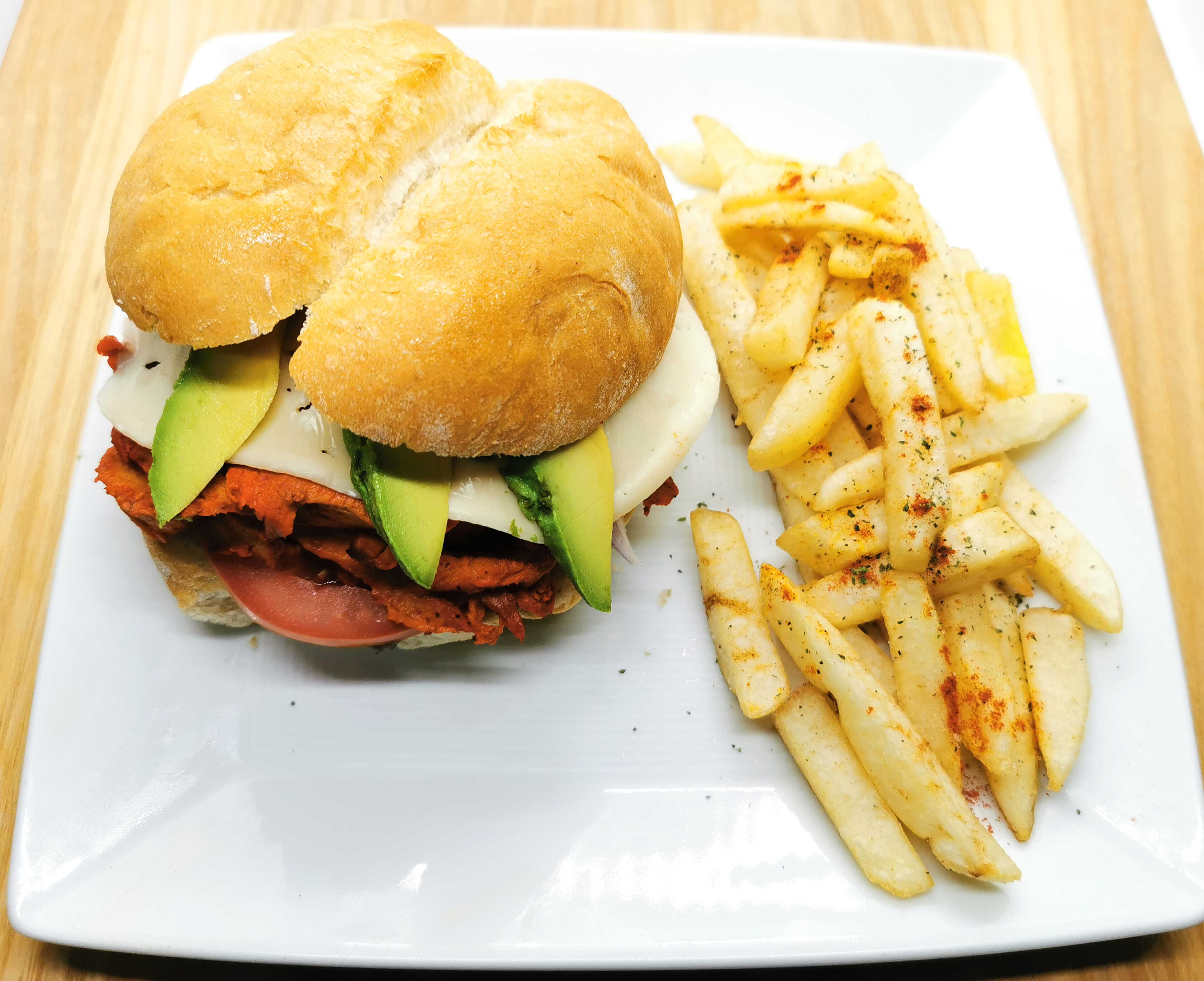 Torta de carne al pastor con mayonesa, frijoles, quesillo, jitomate, cebolla y aguacate.