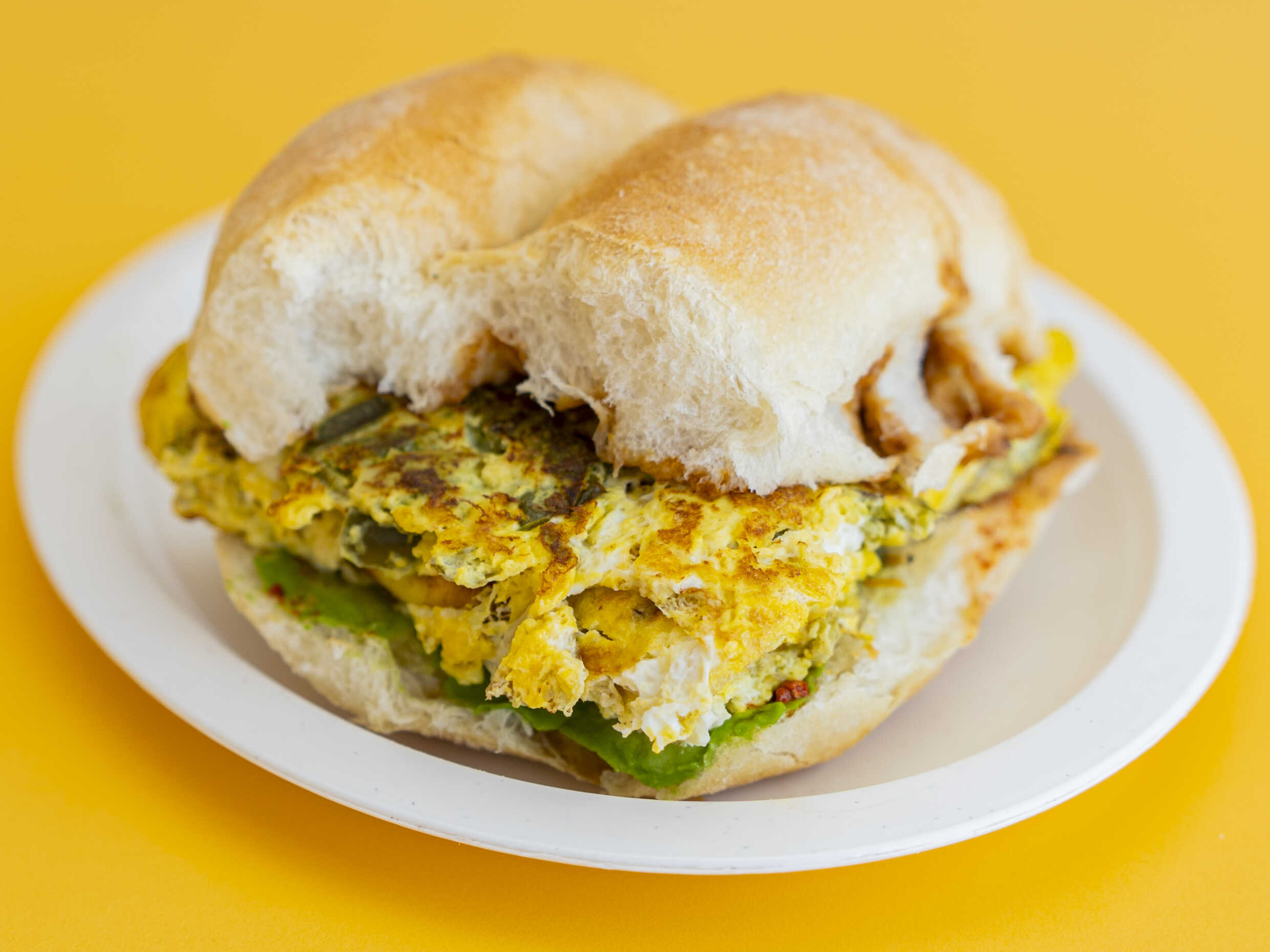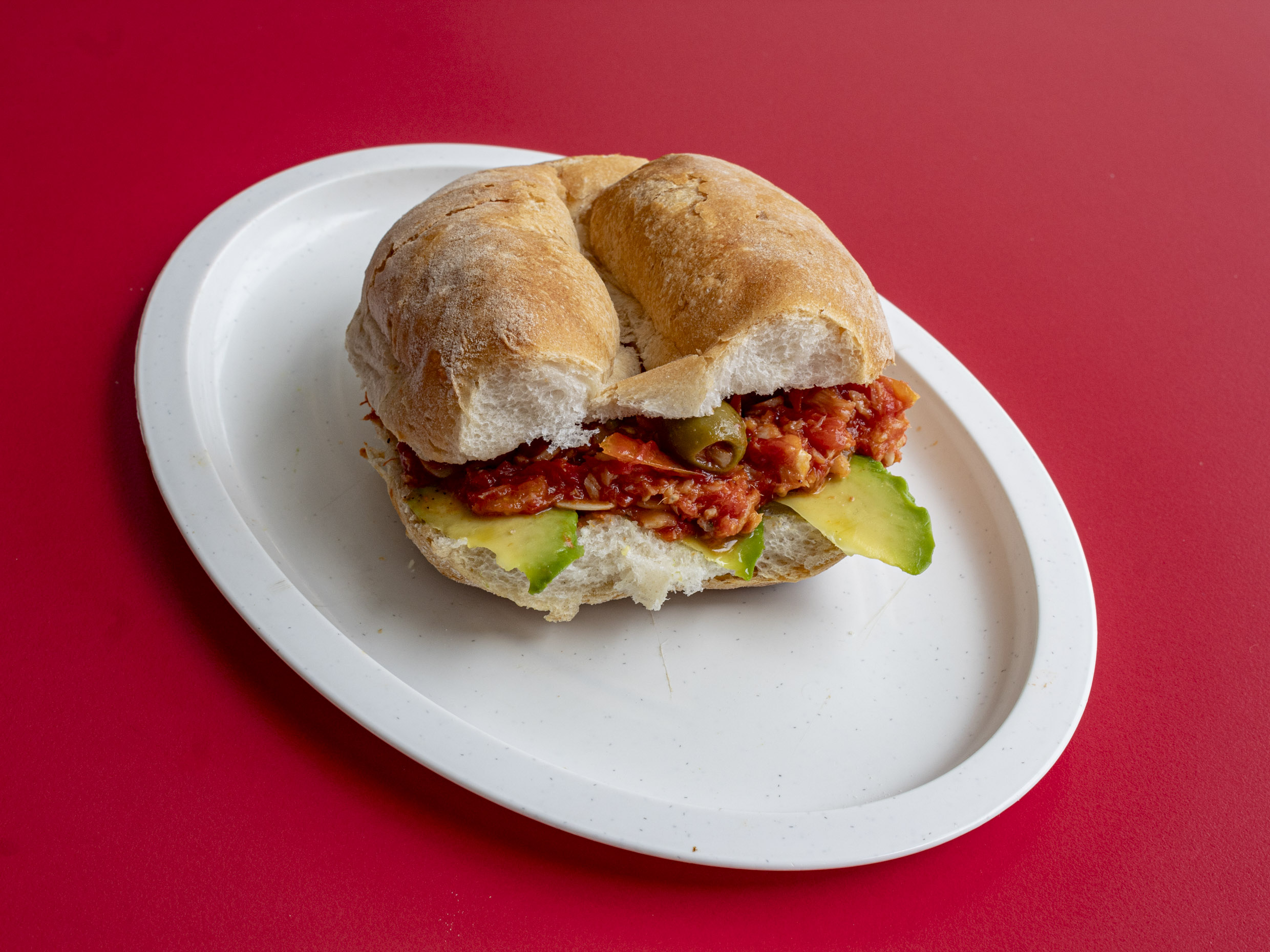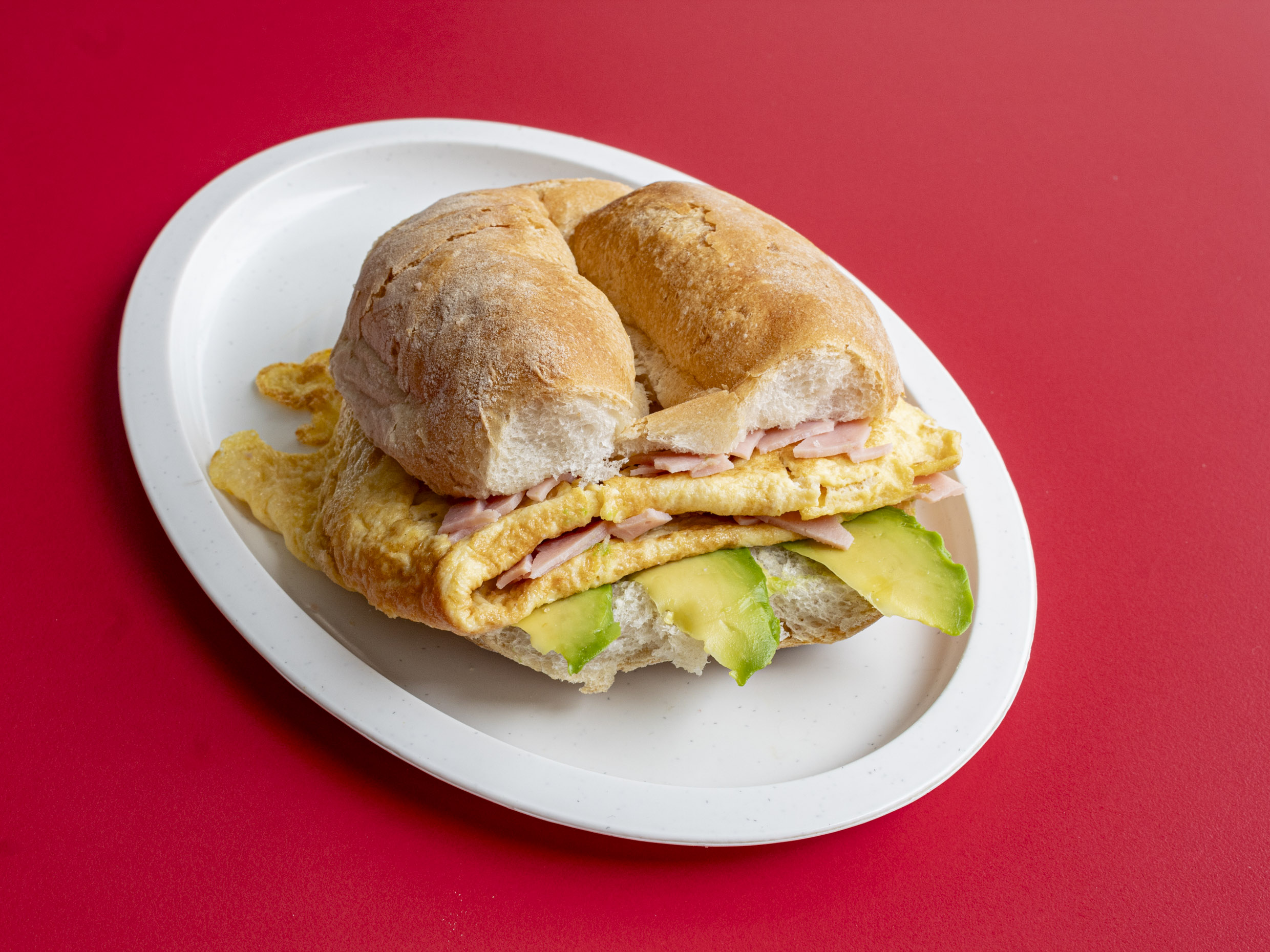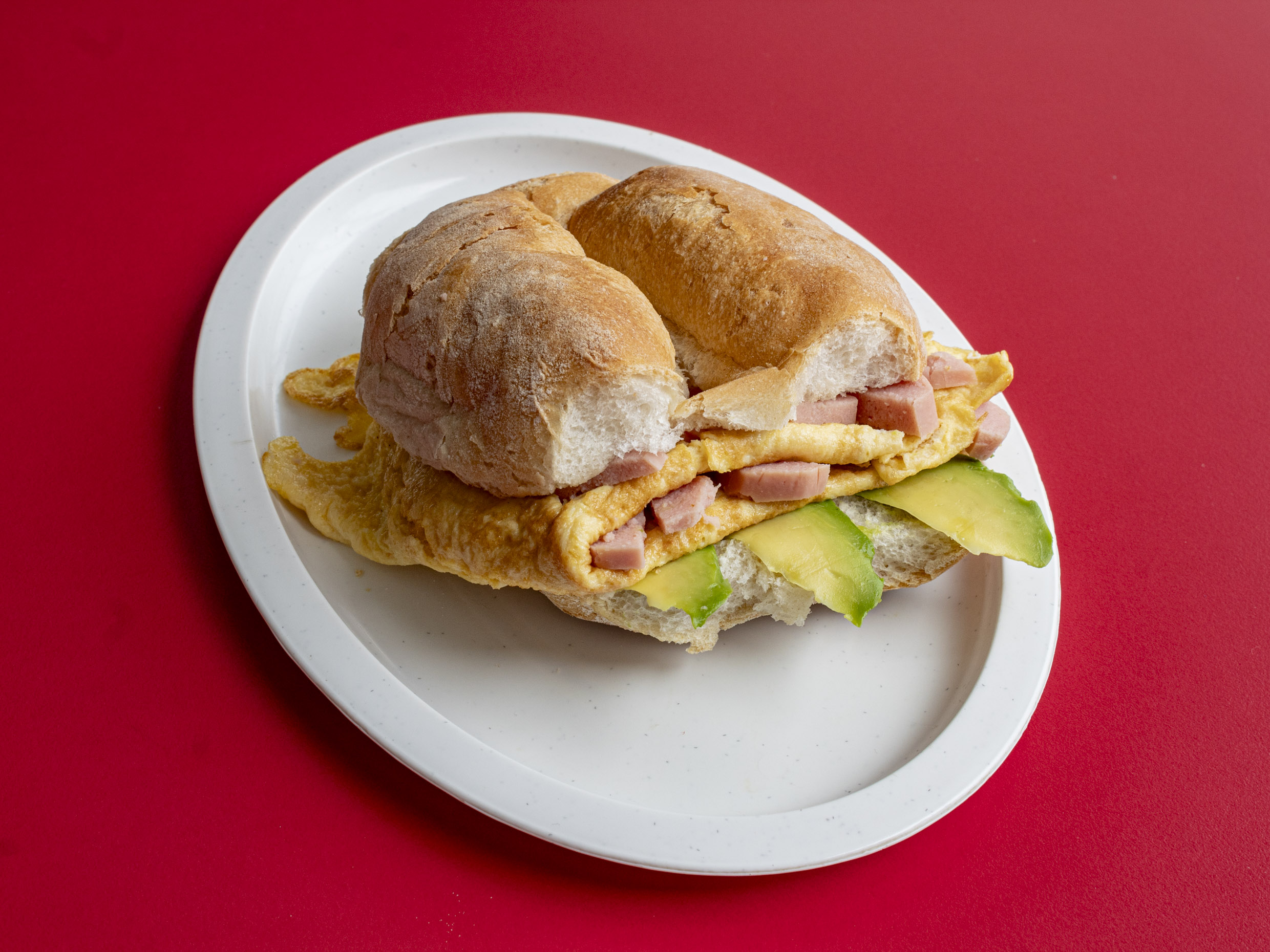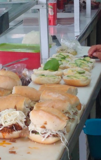 Torta de jamon, pierna y queso amarillo, base de aguacate, frijol, aceite de comer y picante al gusto