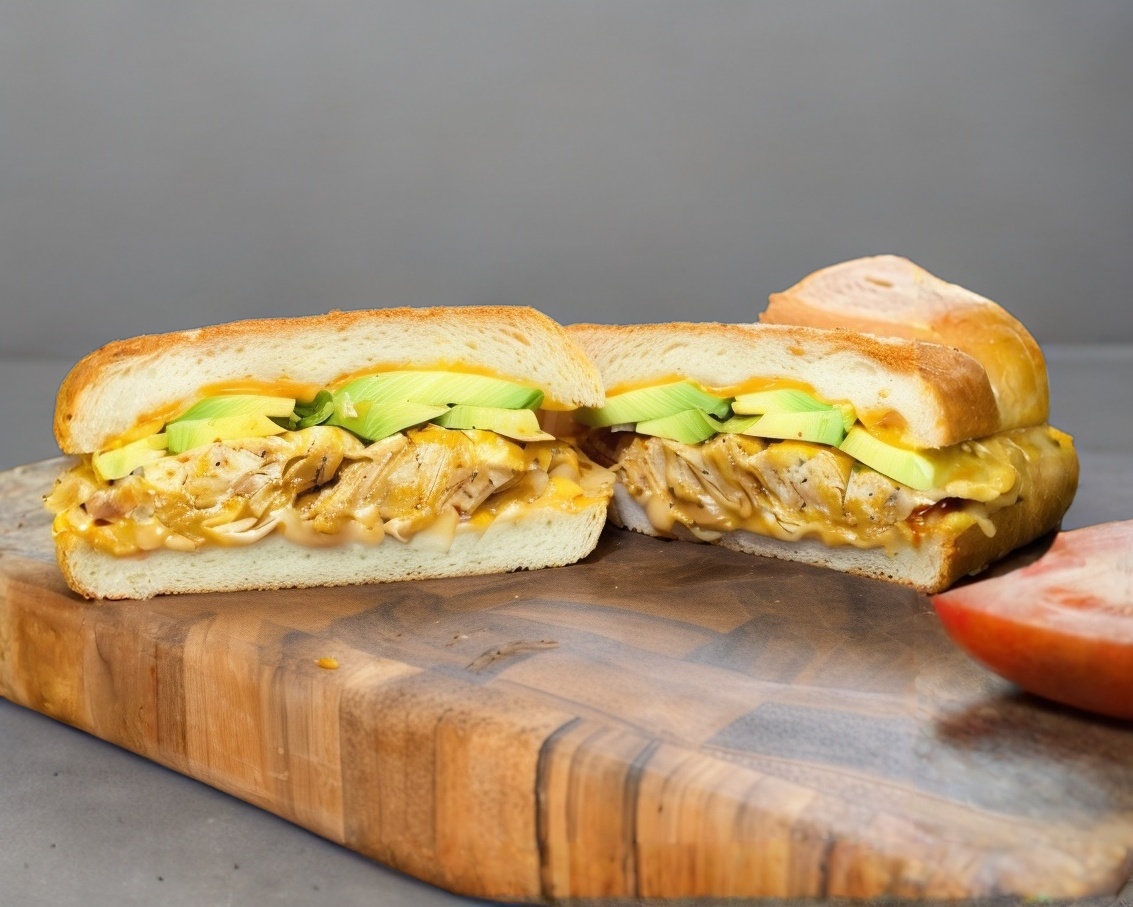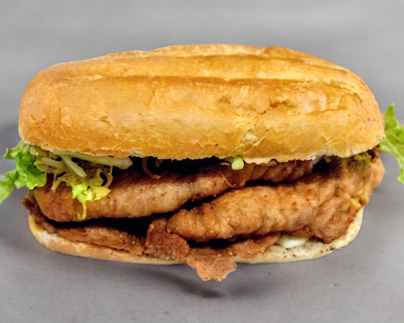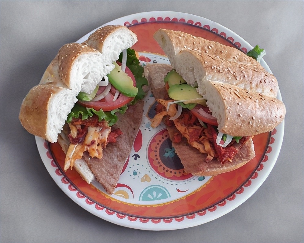Milanesa de pollo, chuleta, manchego y Philadelphia, preparada con lechuga, jitomate, cebolla, aguacate, mayonesa y picante.