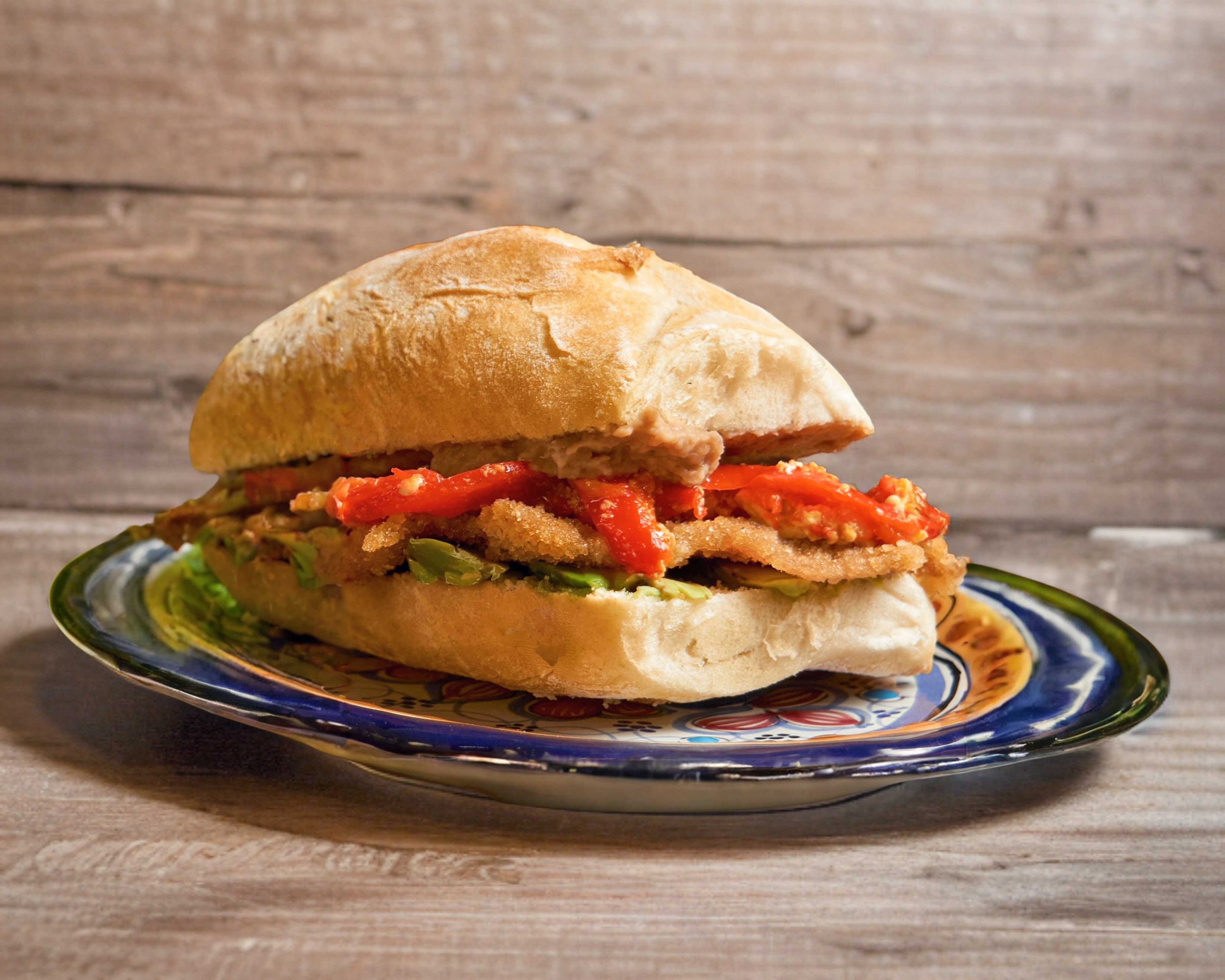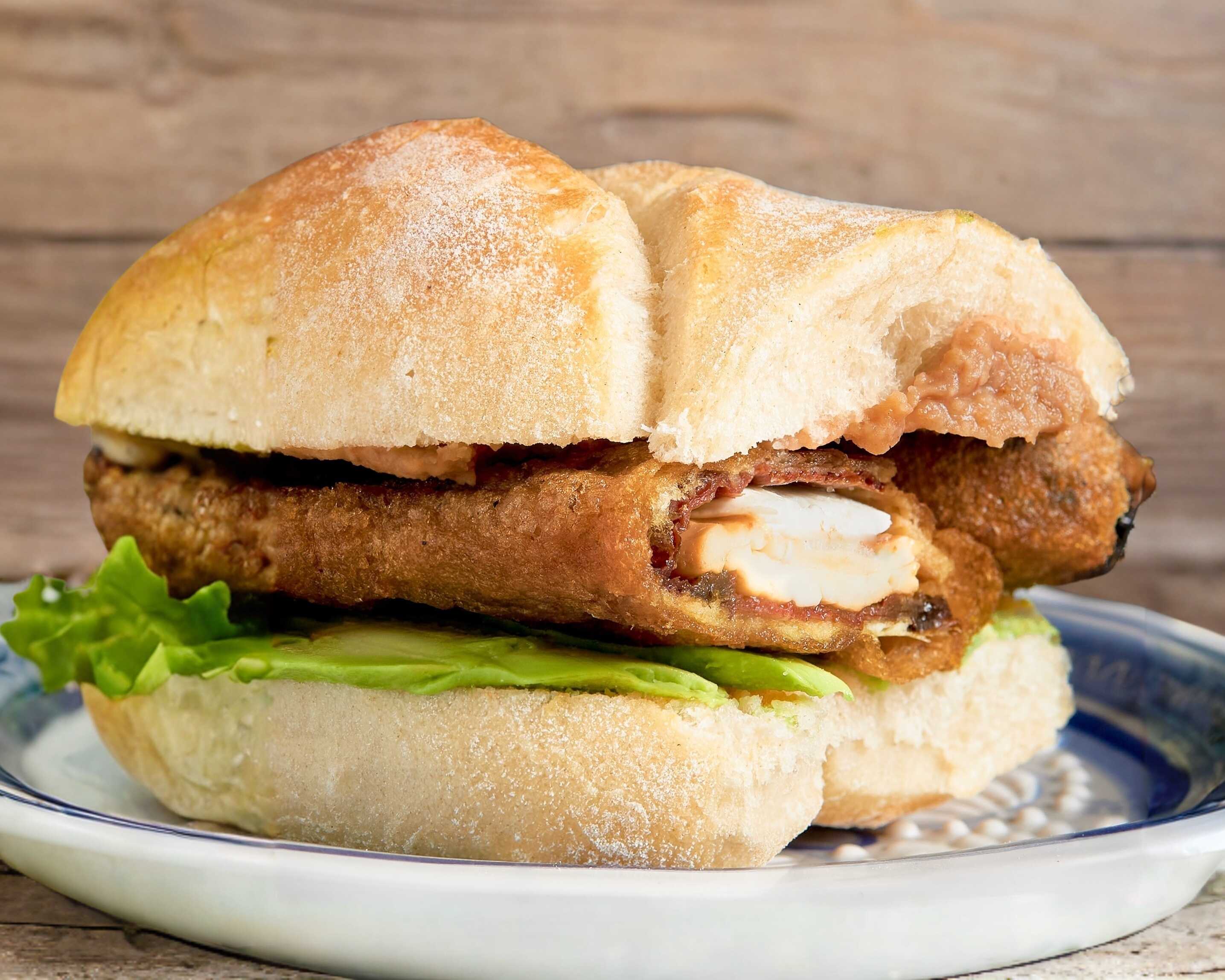 Tradicional Torta de agua con Frijoles de nuestra antigua receta, Aguacate y Chipotle capeado relleno de queso