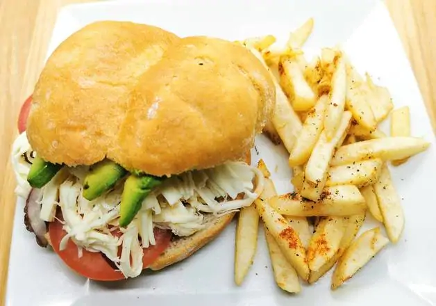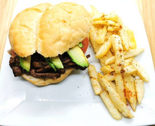 Torta de arrachera, con queso Oaxaca, guacamole, mayonesa, frijoles y jalapeños.