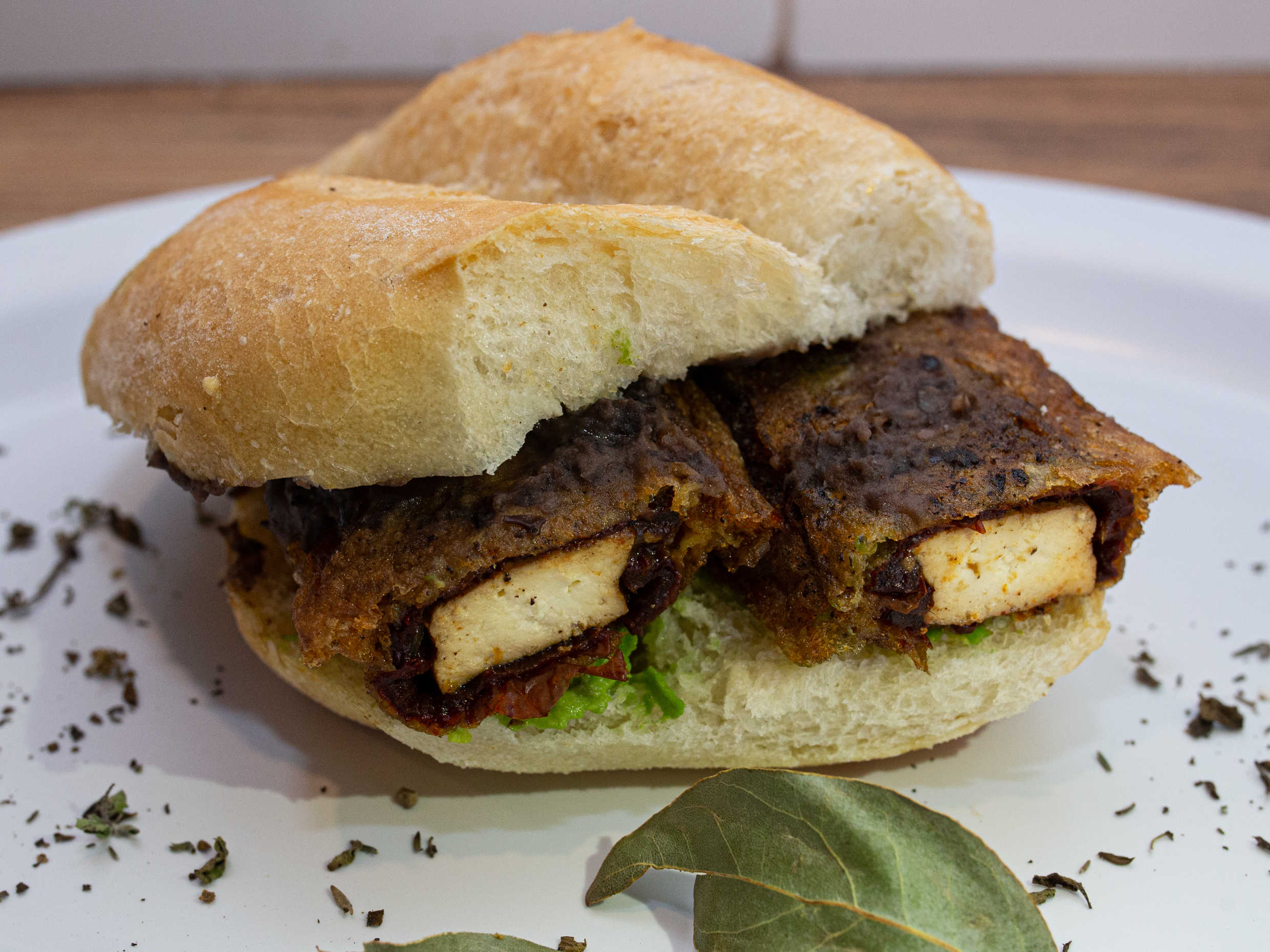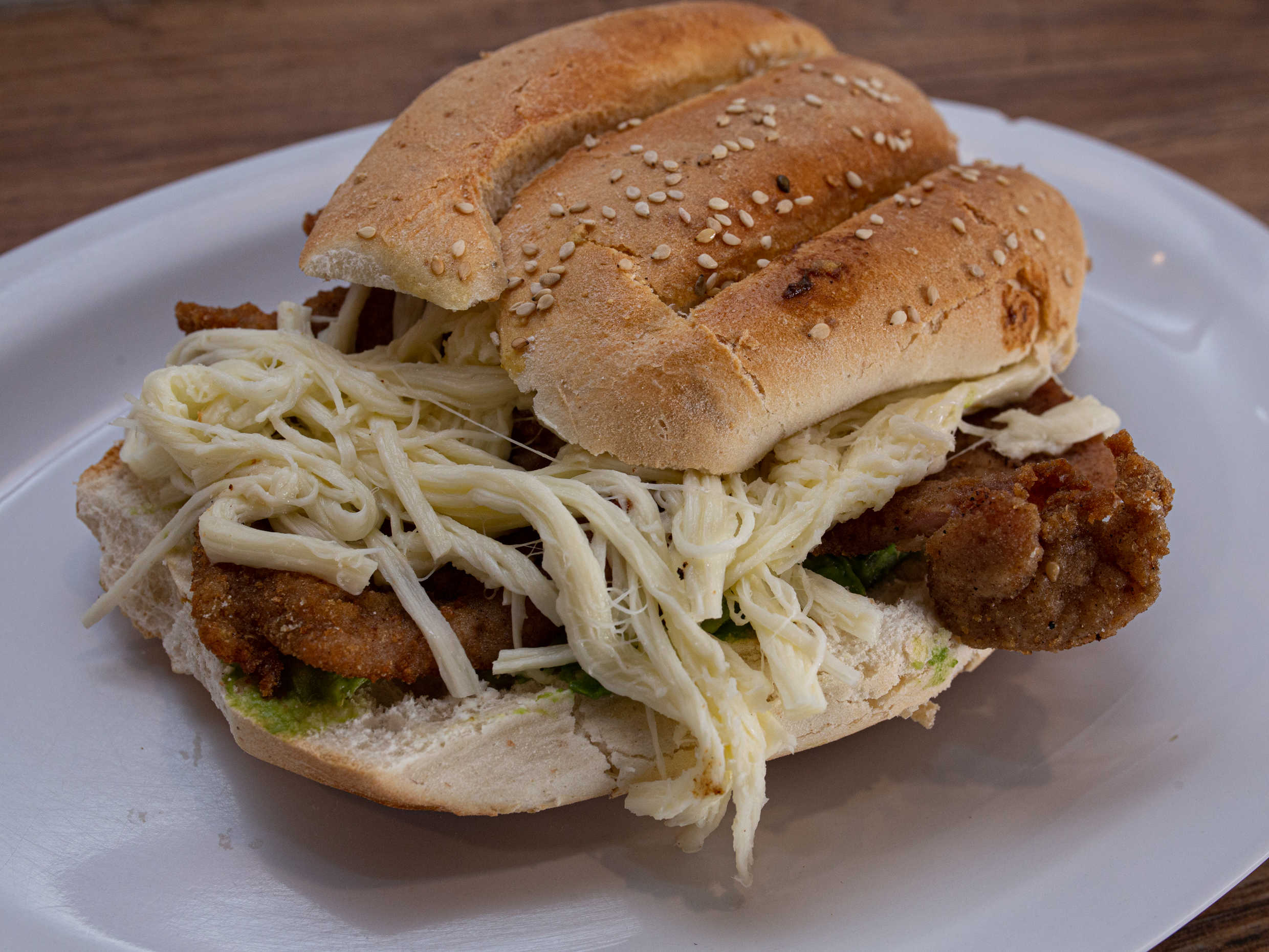 Torta tamaño especial, una rica milanesa de cerdo, queso oaxaca, frijoles refritos, aguacate y mantequilla.