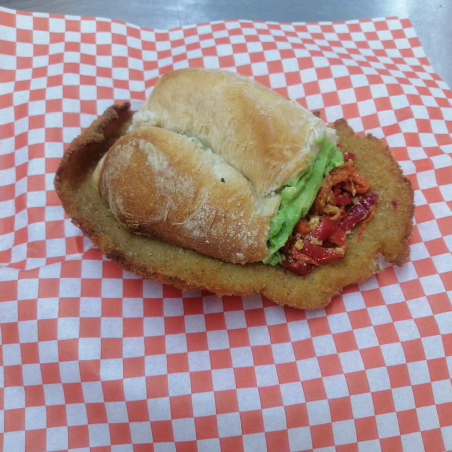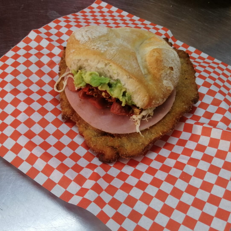 milanesa de pollo,aguacate,frijoles, jamon, quesillo, salchicha y picante