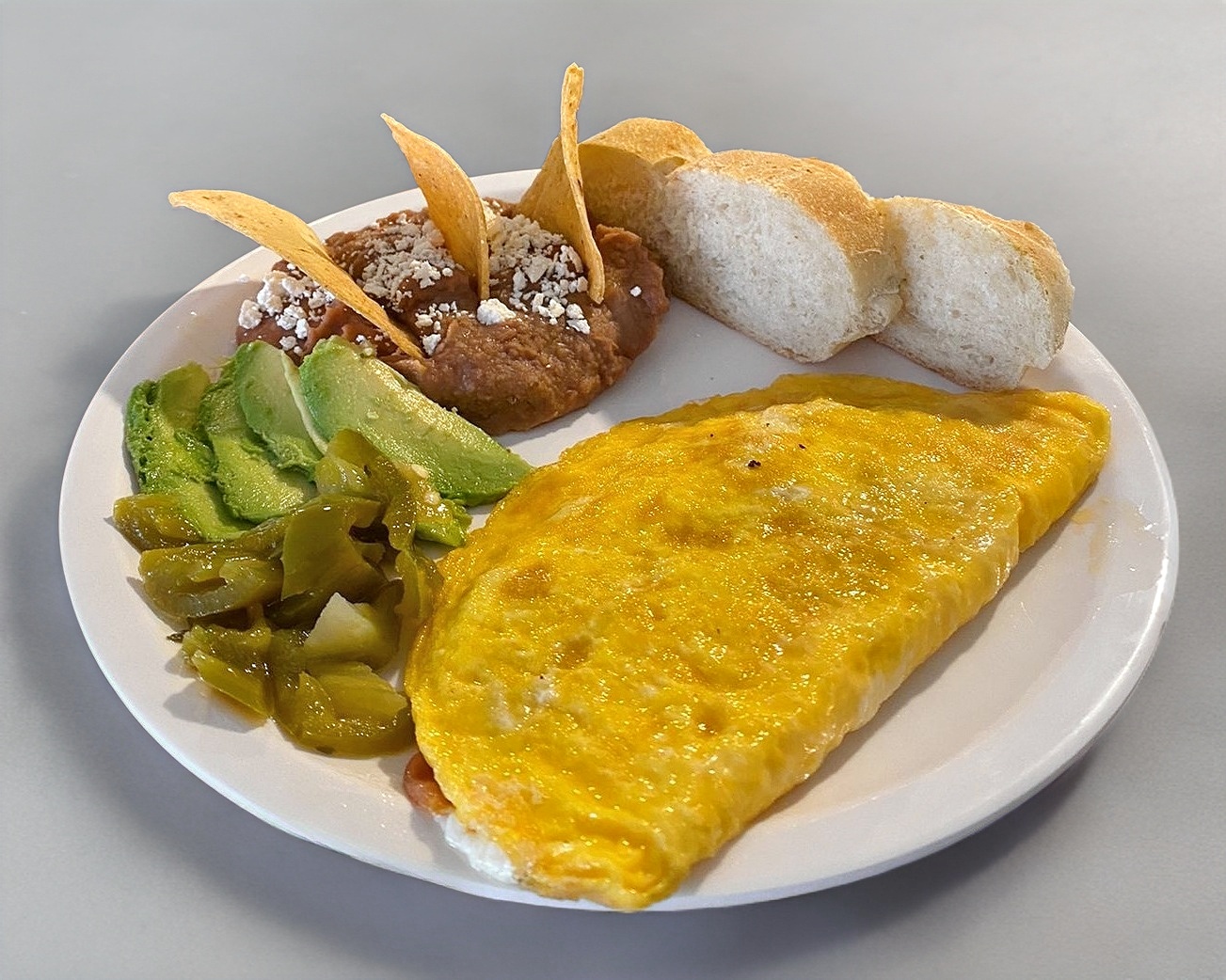 Omelette acompañados con frijoles con totopos, aguacate, 2 pedacitos de pan y picante.
