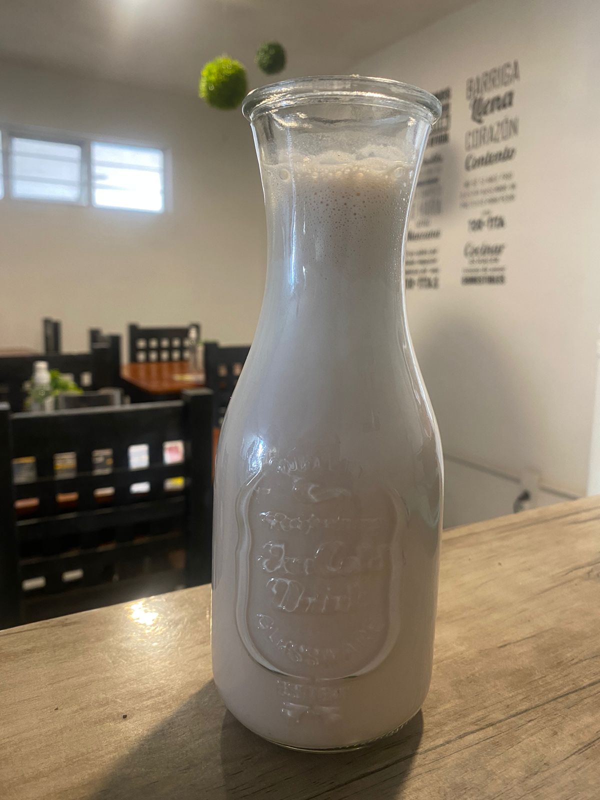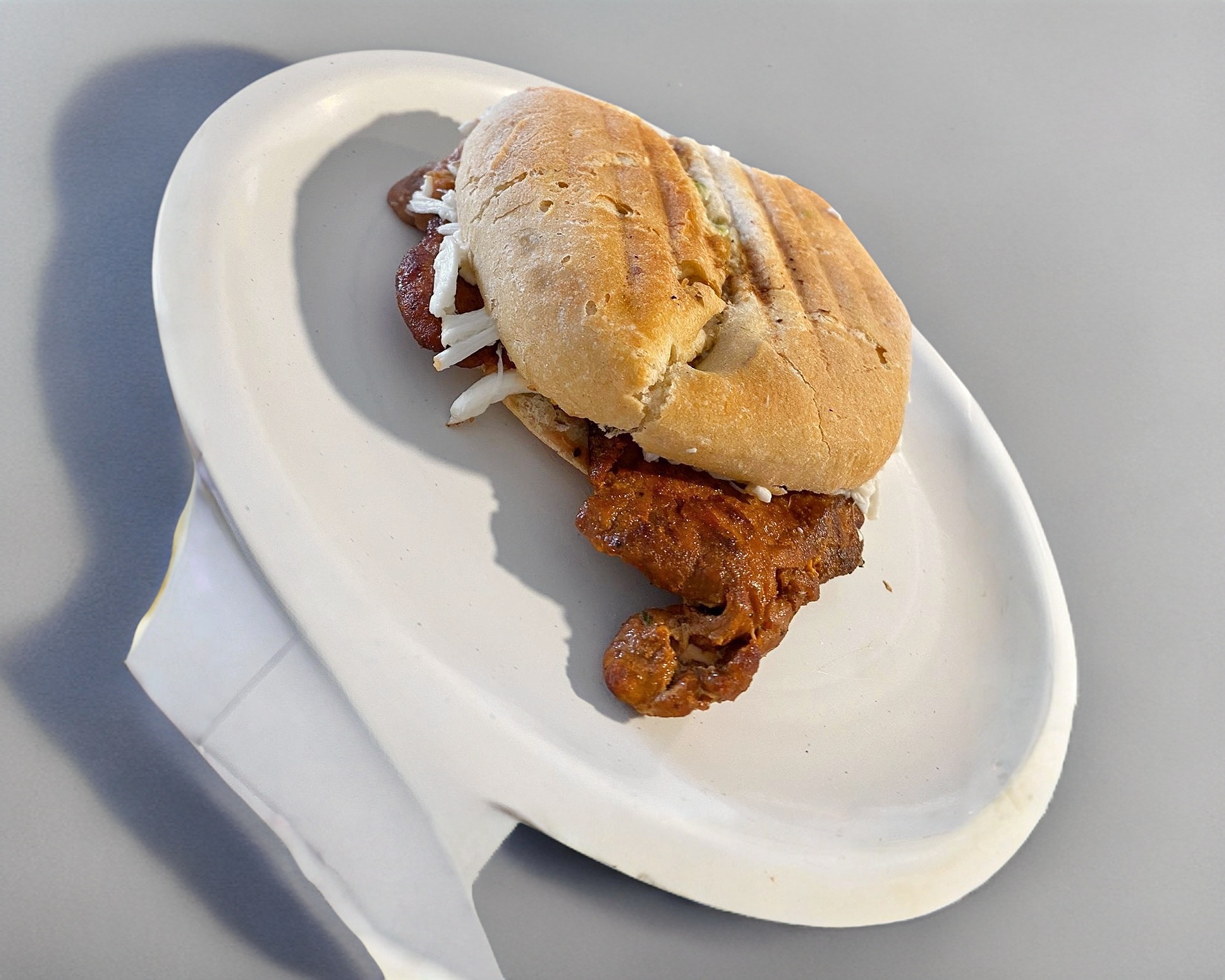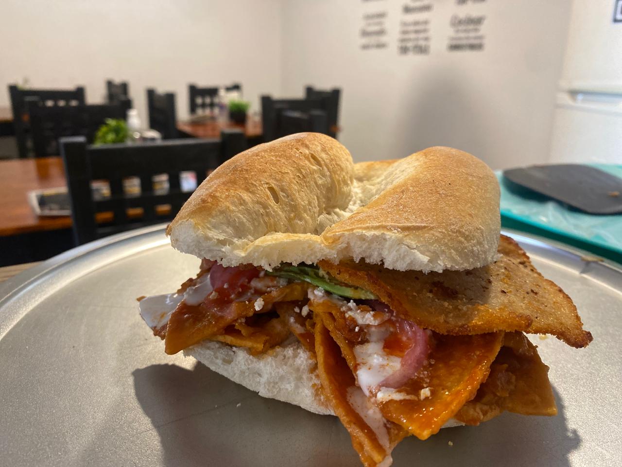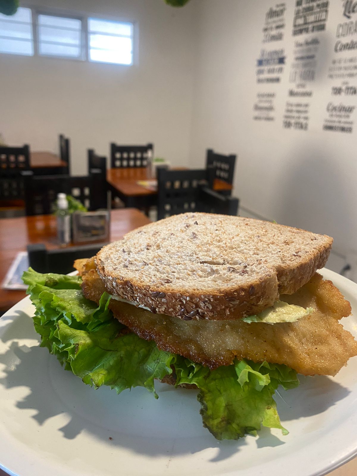 Milanesa de cerdo, quesillo, mayonesa, aguacate, frijoles y picante.