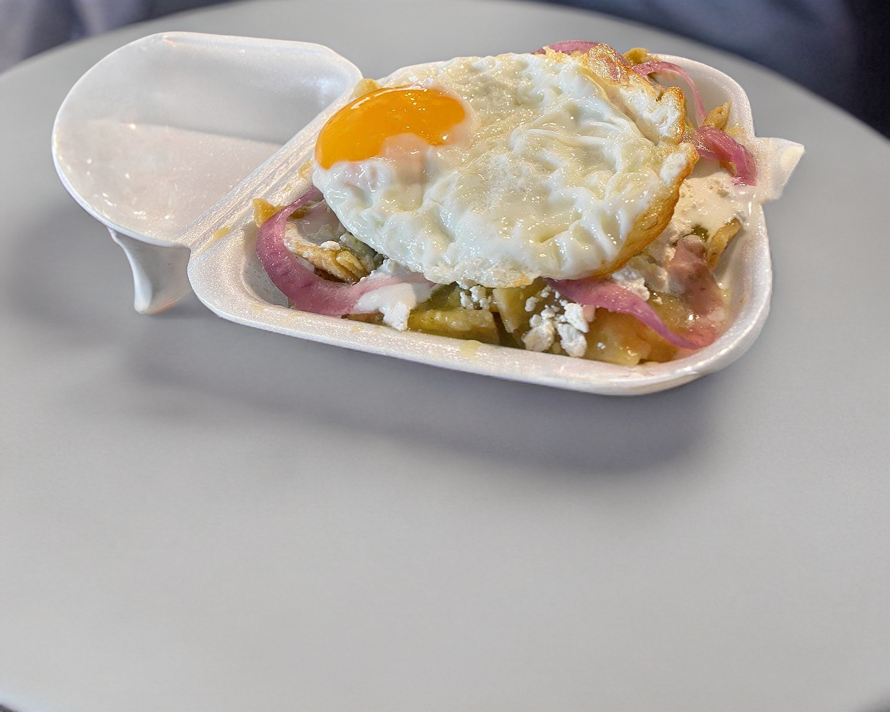 Chilaquiles, huevo estrellado, crema, queso, aguacate, cebolla.