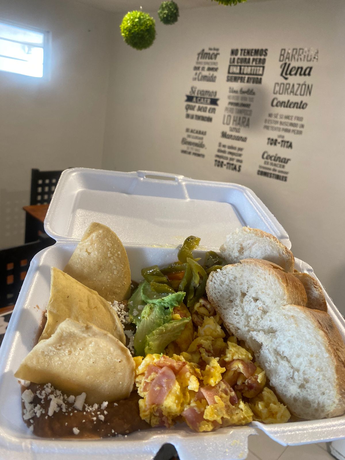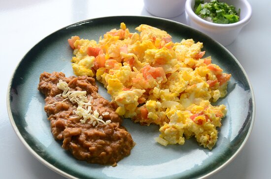 Huevos revueltos, acompañados con frijoles con totopos, aguacate, 2 pedacitos de pan y picante.