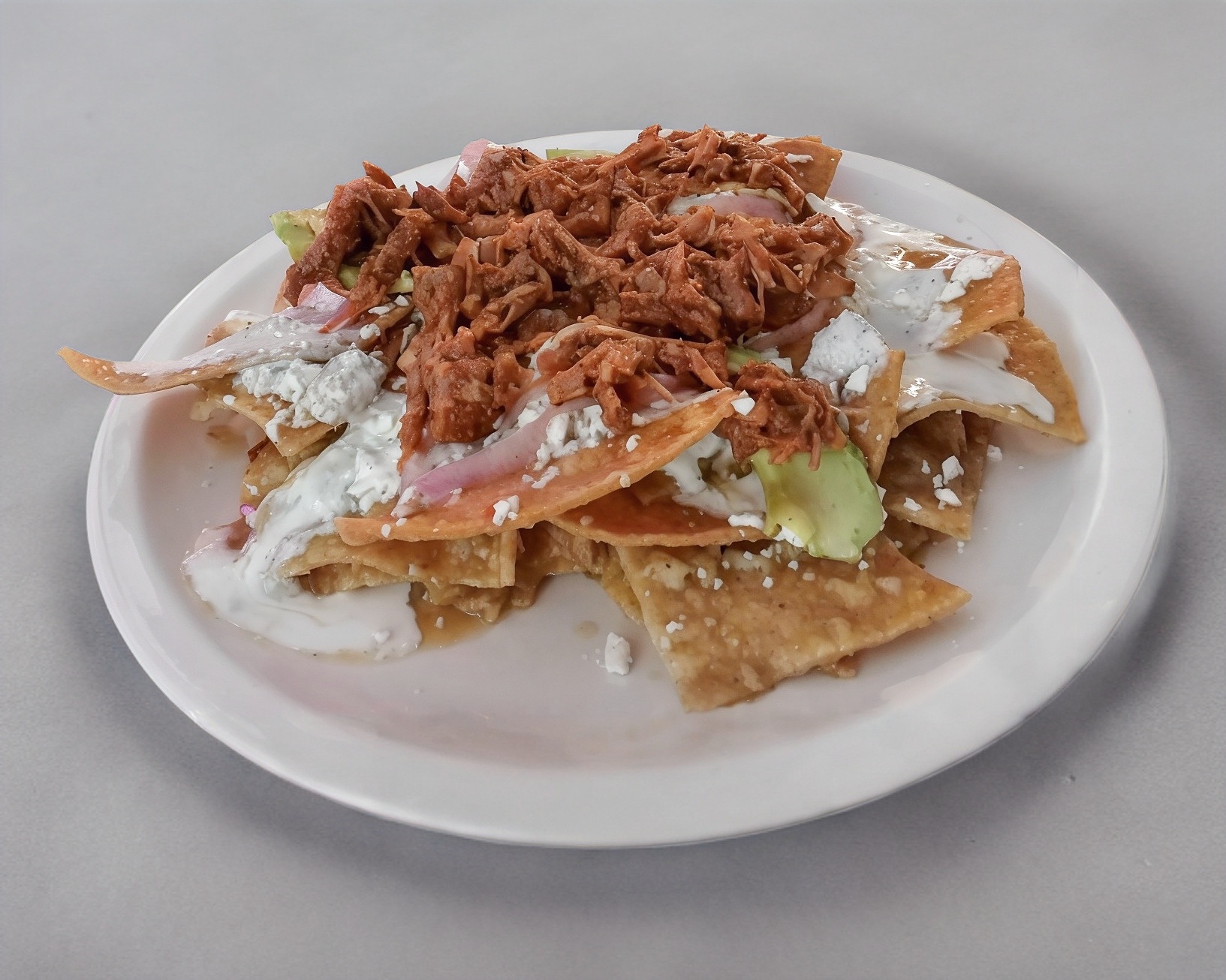 Chilaquiles, cochinita, crema, queso, aguacate, cebolla.