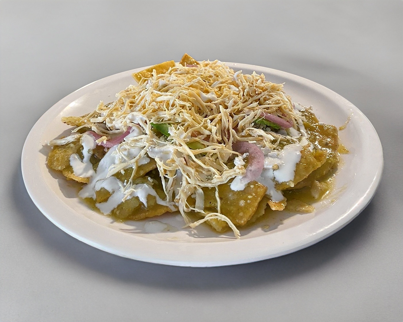 Chilaquiles, milanesa de pollo, crema, queso, aguacate, cebolla.