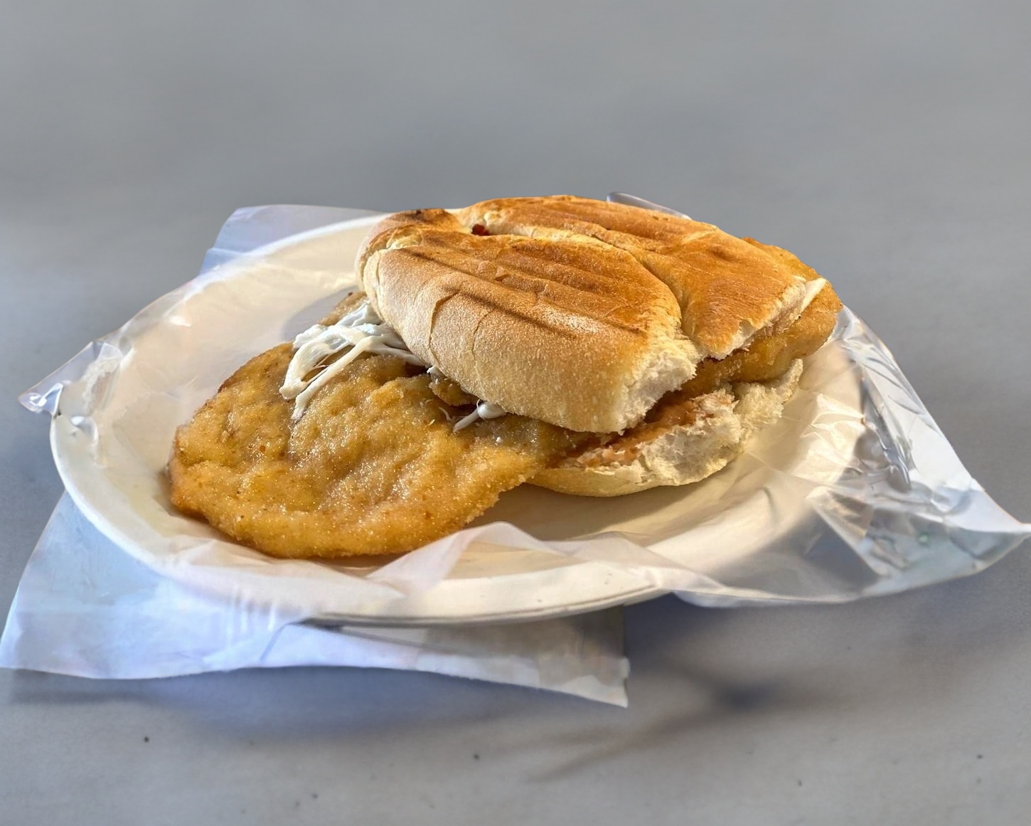 Milanesa de pollo, quesillo, mayonesa, aguacate, frijoles y picante.