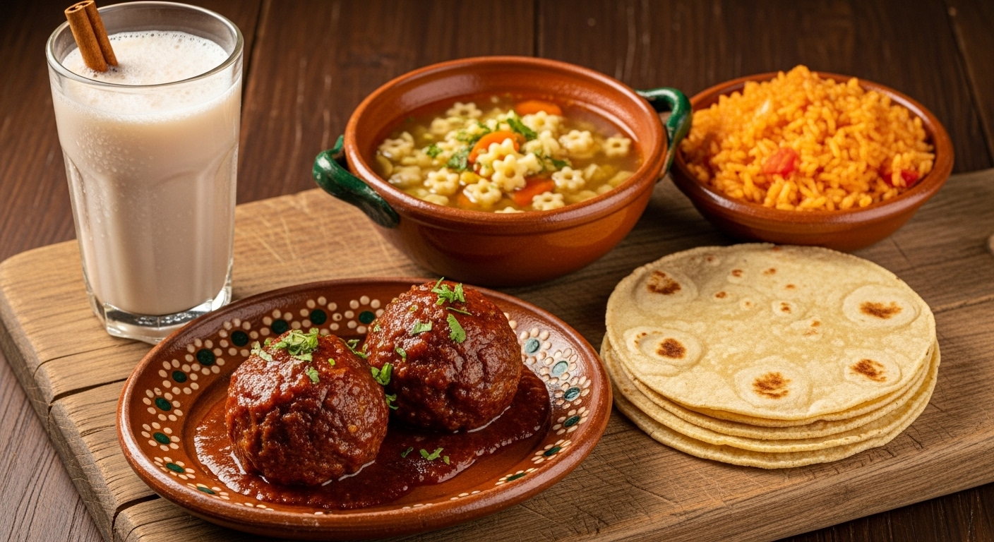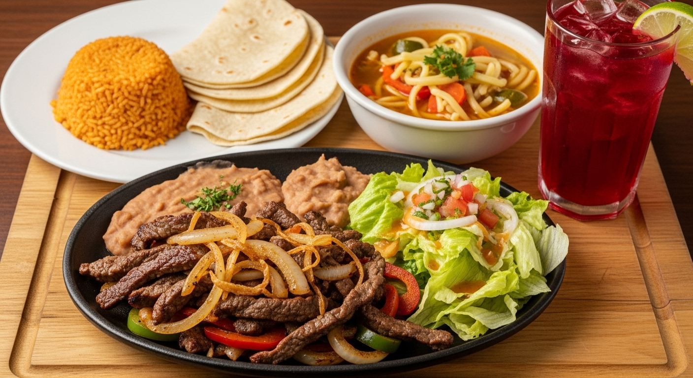 Plato fuerte (bistecs encebollados con frijoles refritos y ensalada fresca de lechuga) plato de sopa aguada, plato de arroz rojo, 5 tortillas más vaso de agua del día con sabores de temporada de 290 ml.