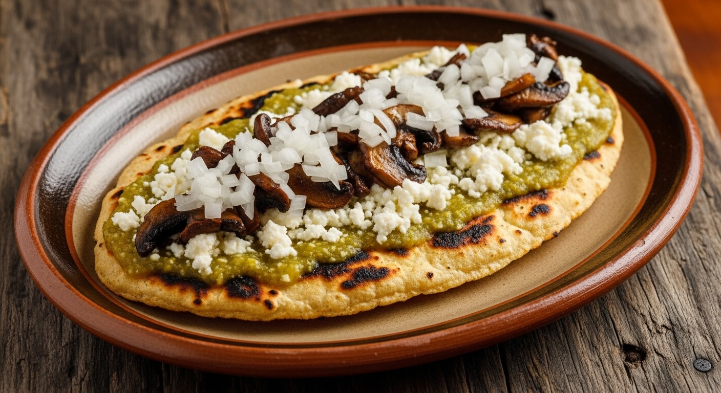 Gordita con salsa a elegir, queso, cebolla y champiñones asados.