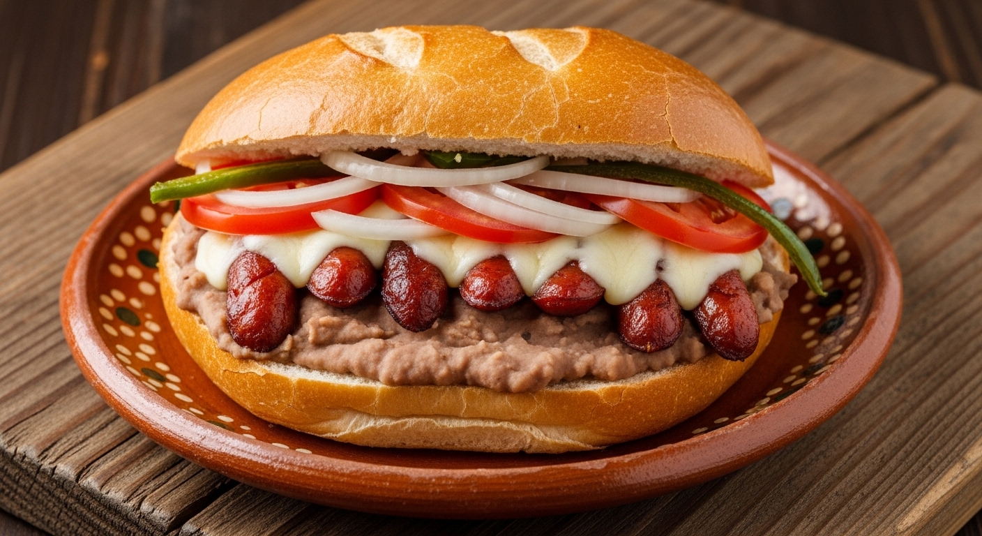 Torta de salchichas preparada con frijoles refritos, quesillo, jitomate, cebolla y picante a elegir.
