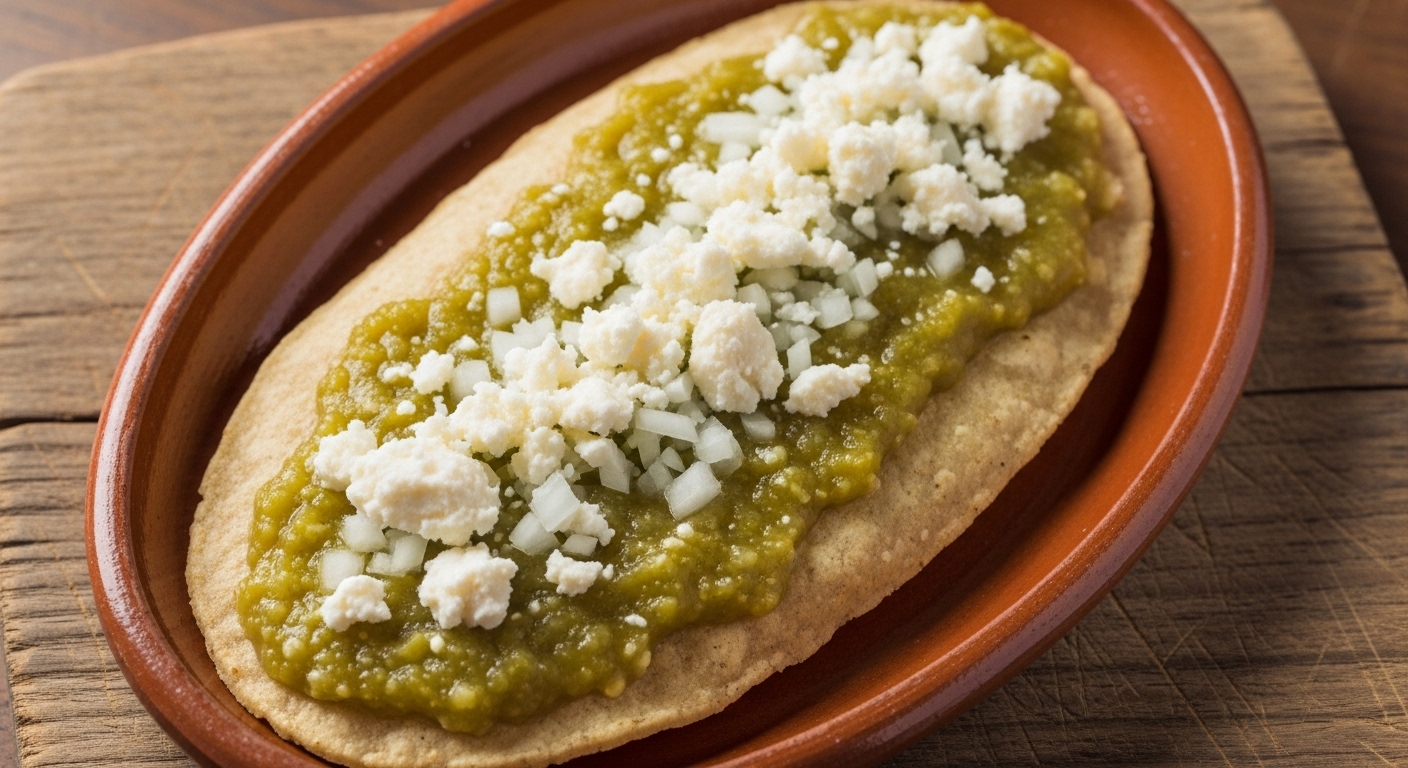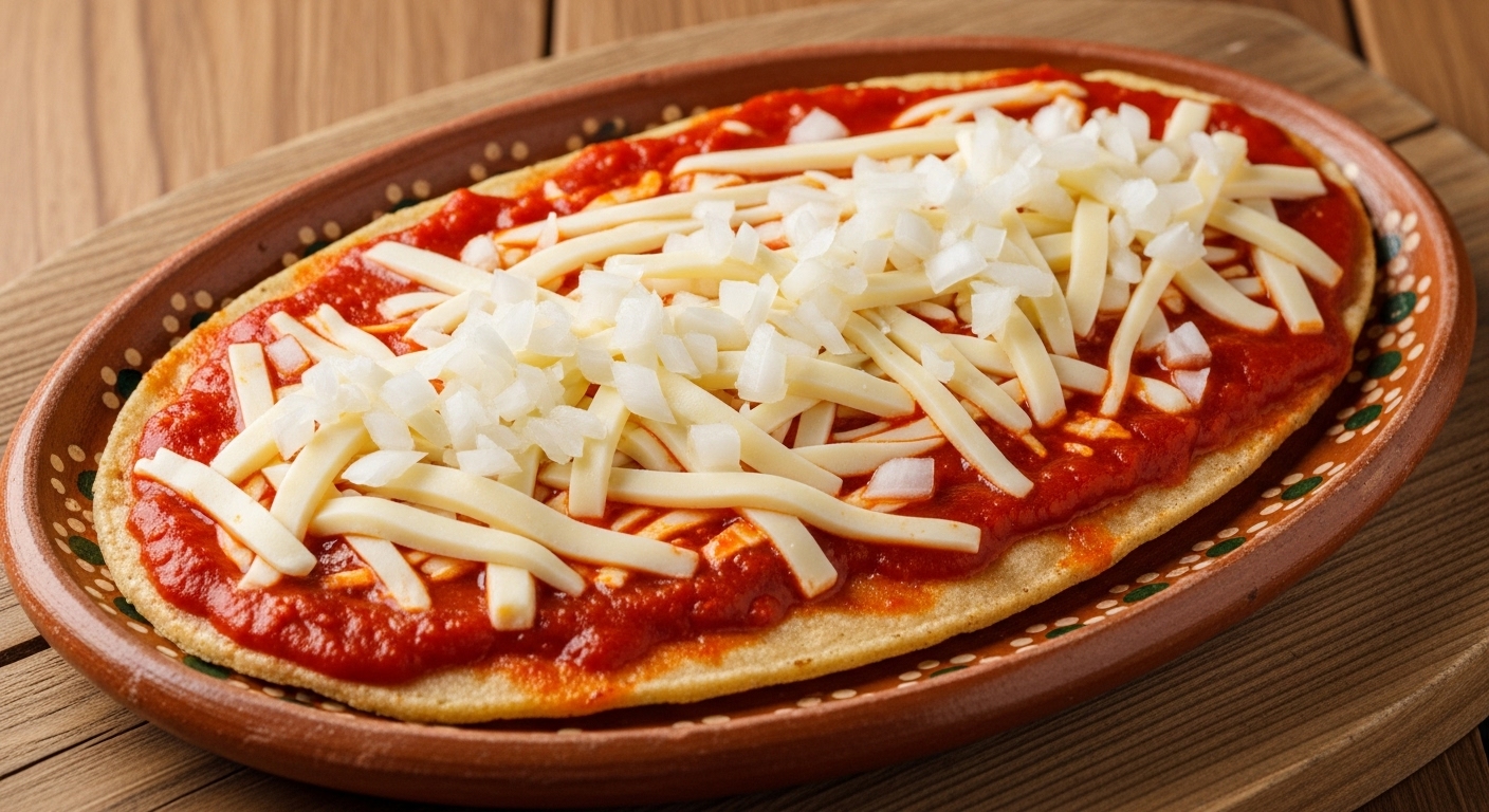 Memela con salsa a elegir, queso y cebolla.