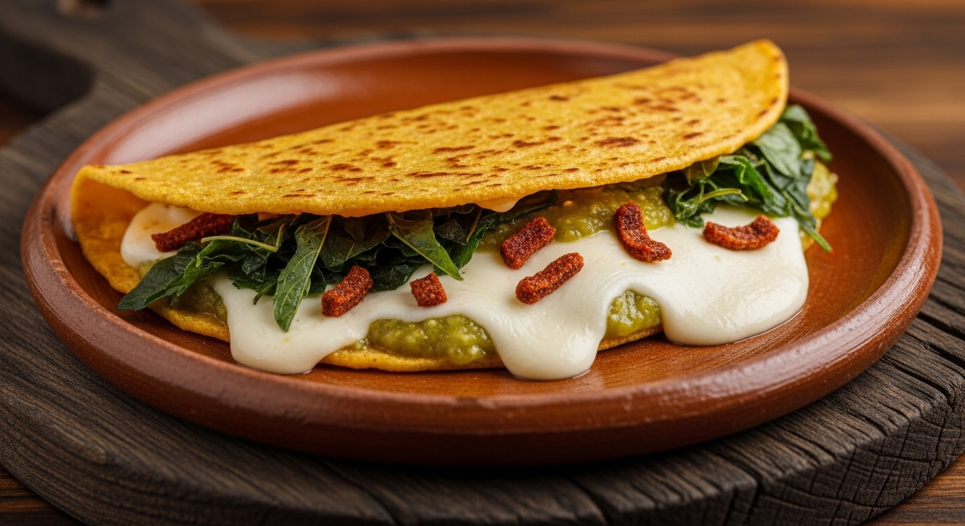 Quesadilla con picante a elegir, quesillo, epazote y chicharrón prensado.
