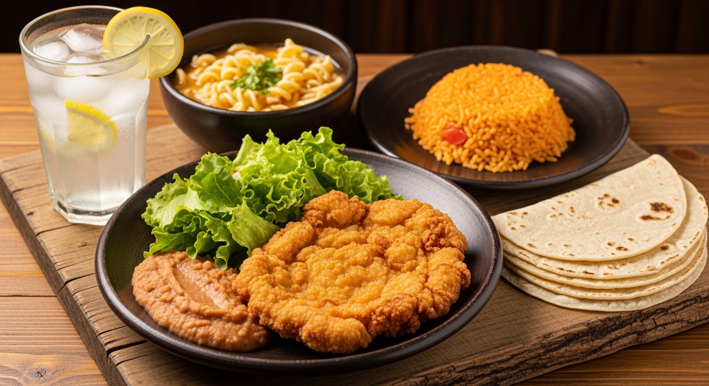 Plato fuerte (milanesa de pollo frita con frijoles refritos y ensalada fresca de lechuga) más plato de sopa aguada, plato de arroz rojo, 5 tortillas más vaso de agua del día con sabores de temporada de 290 ml.