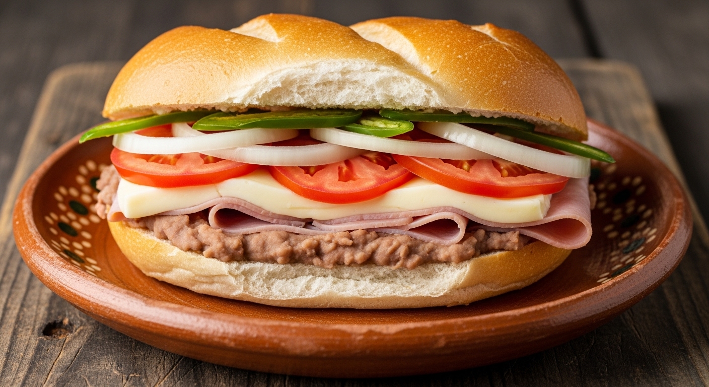 Torta de jamón preparada con frijoles refritos, quesillo, jitomate, cebolla y picante a elegir.
