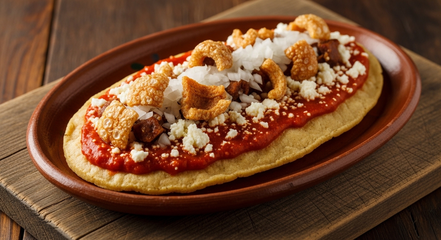 Gordita con salsa a elegir, queso, cebolla y chicharrón prensado.
