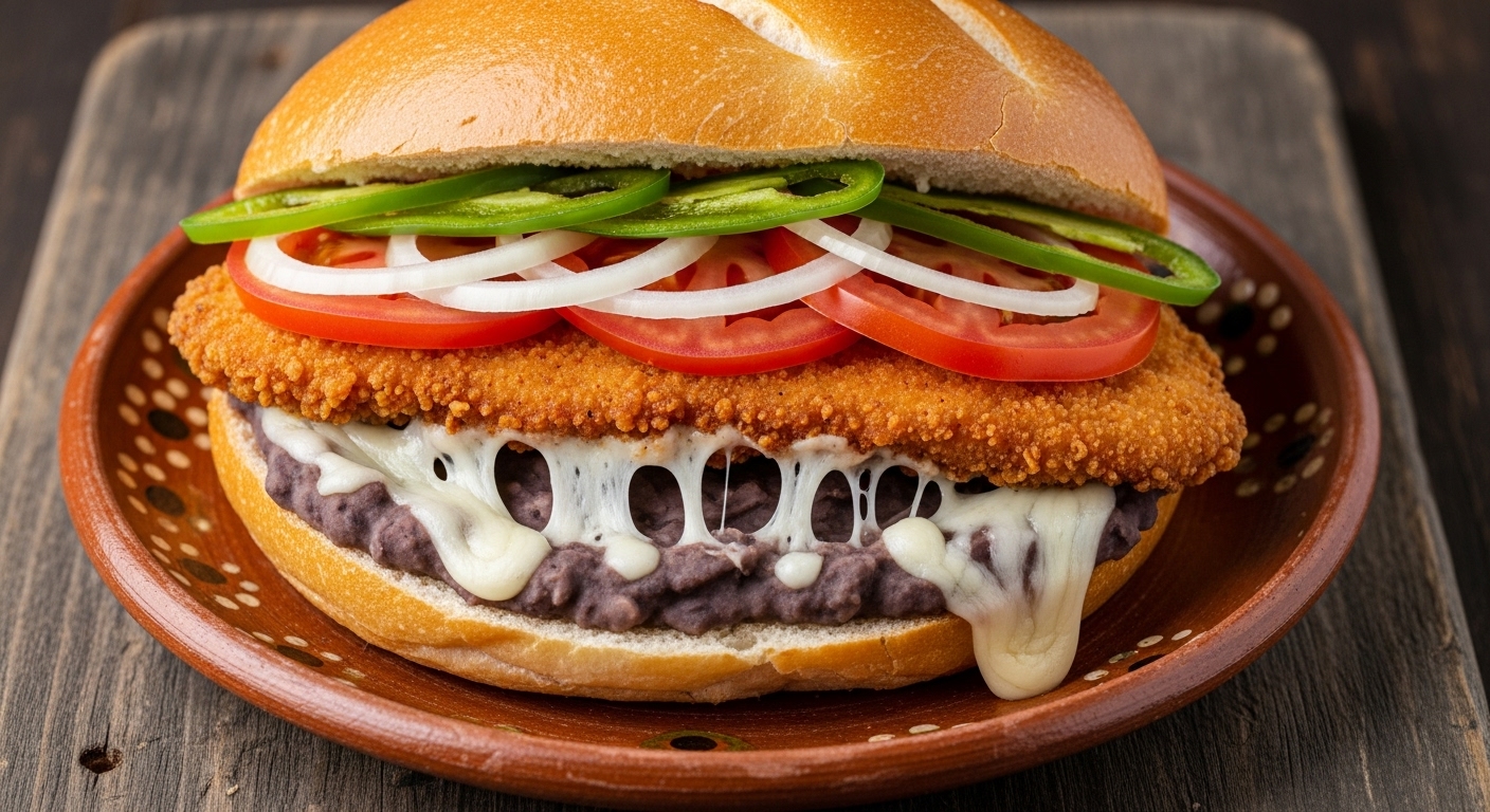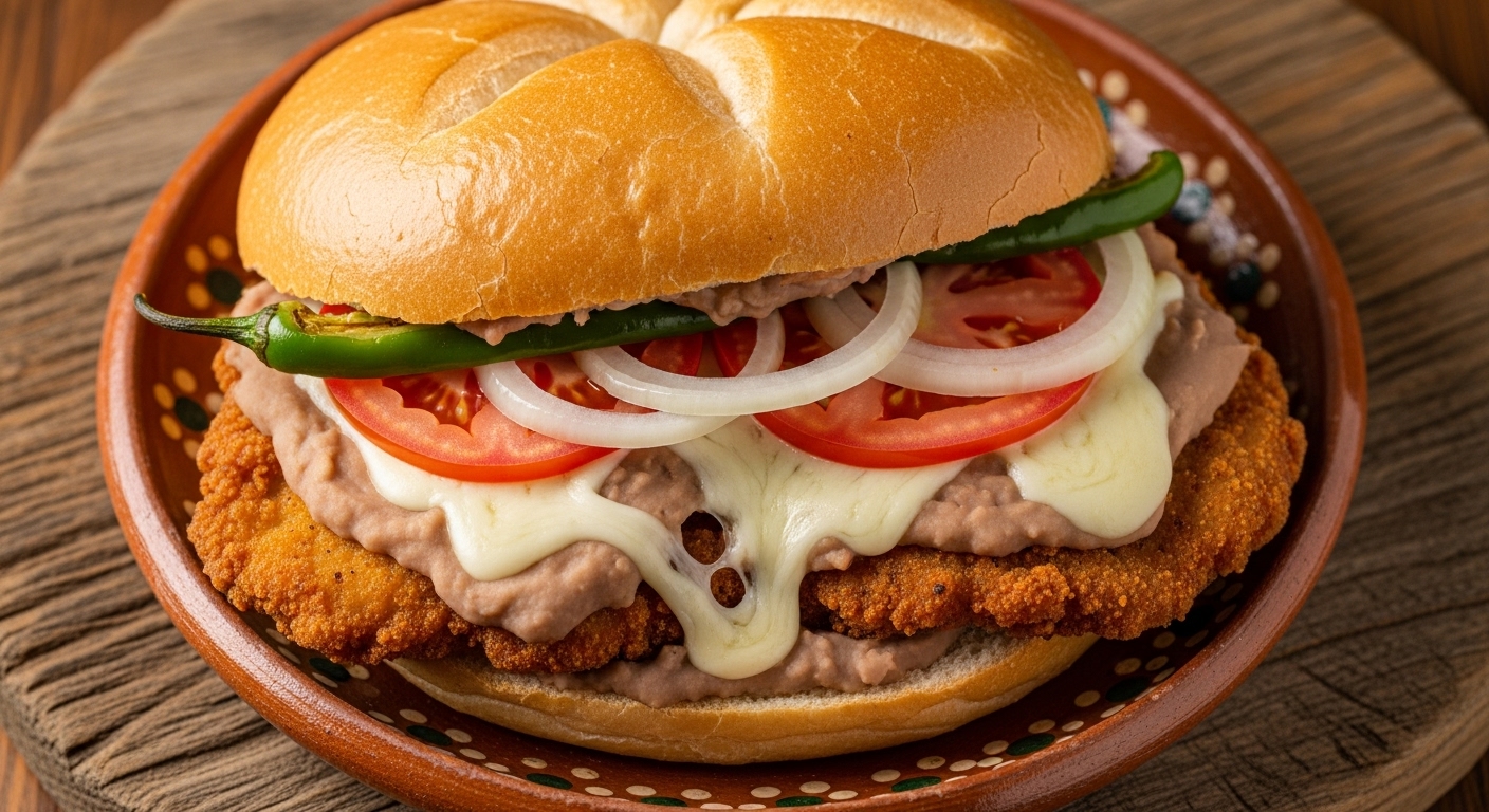 Torta de milanesa de pollo preparada con frijoles refritos, quesillo, jitomate, cebolla y picante a elegir.
