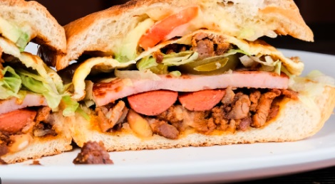 Pan, lechuga, jitomate, cebolla, queso amarillo,jamón, capsu mayonesa , mostaza y rajas
