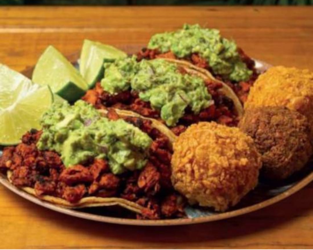 Gracias por comer vegetales!! Grandes Porciones -> 4 Tacos de soya (sabor a escoger) tortilla de maíz o de harina con queso manchego y guacamole, incluye 3 bolitas de papa, falafel o combinadas, opción vegana sin queso. Incluye un aderezo aparte + 1 bebida (PUEDES ESCRIBIRNOS 2229092904)