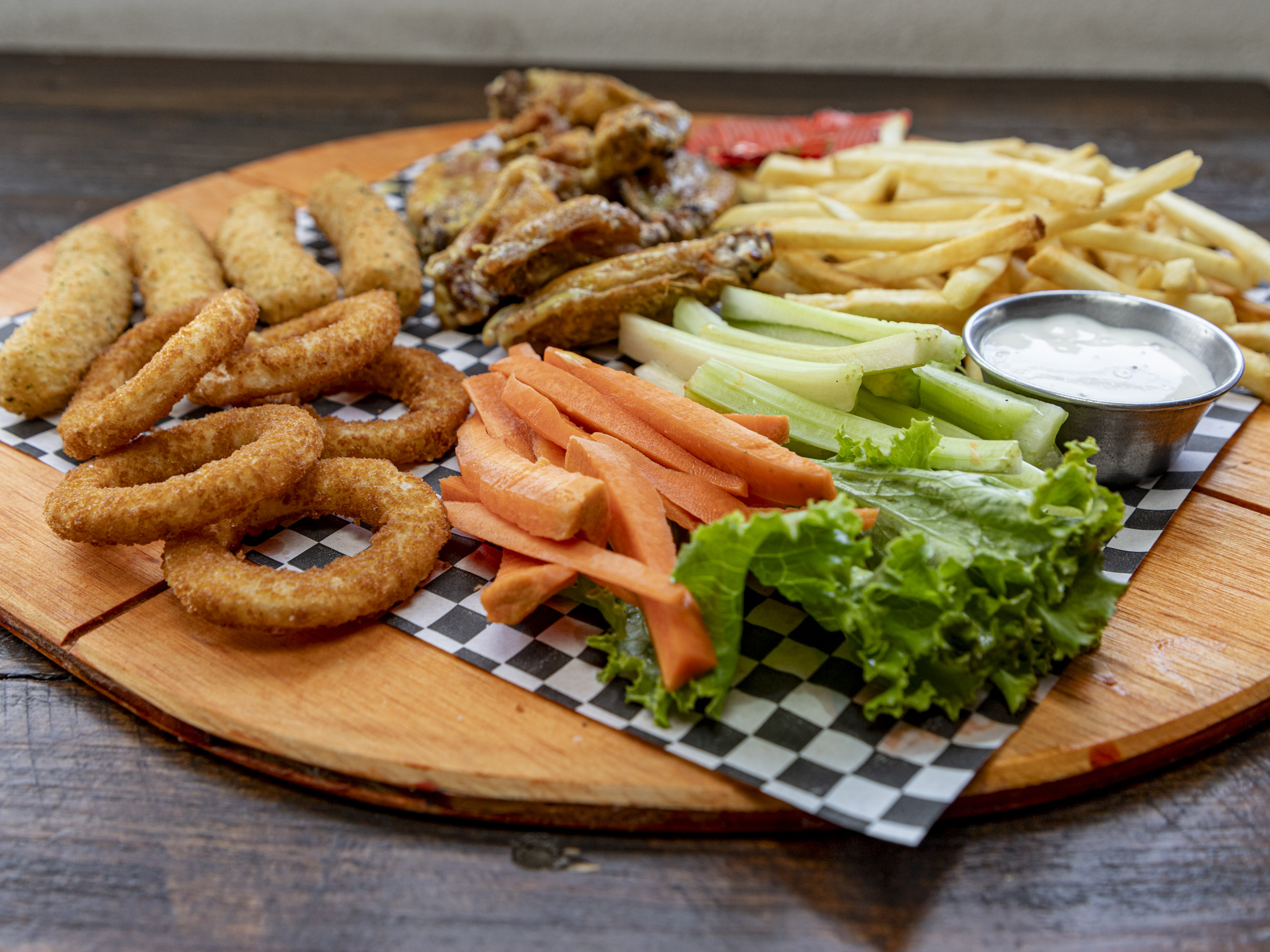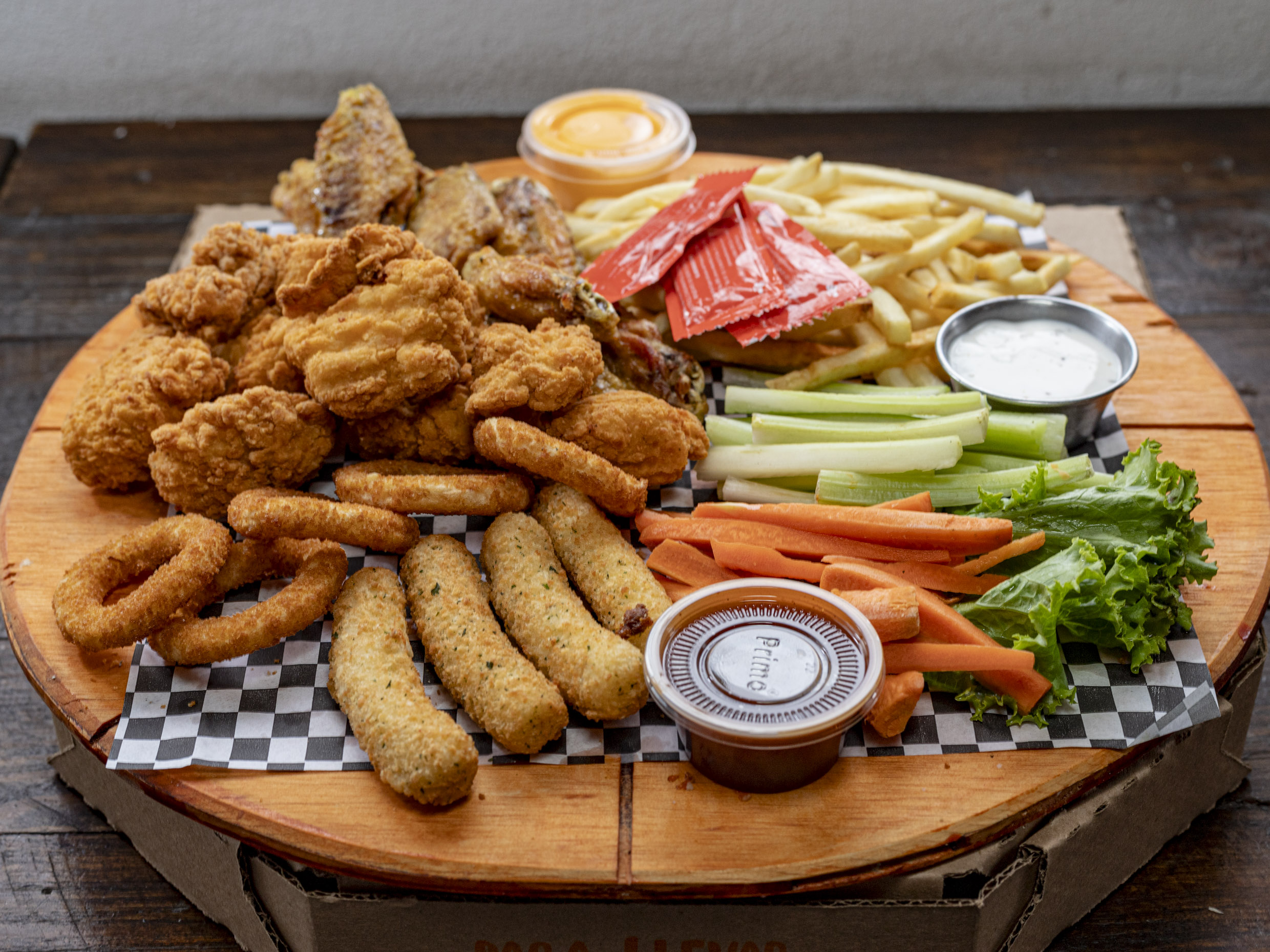 200 gr de papas a la francesa, 4 dedos de queso, 5 alitas y 6 aros de cebolla. Queso, cátsup, bluechese y salsa para alitas.
