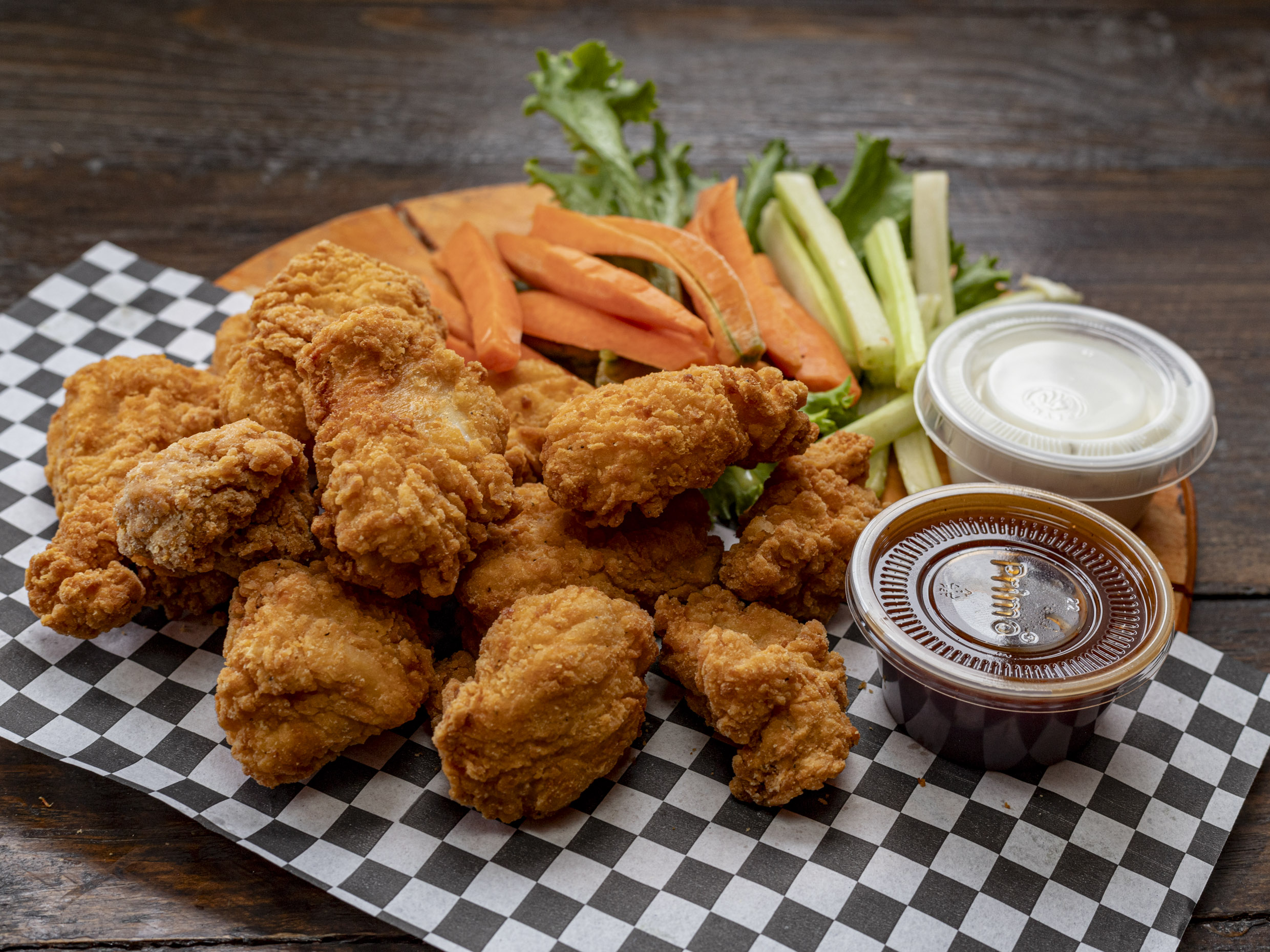 1/4 Kg de boneless de pechuga de pollo crujientes receta secreta bañados en tu salsa favorita con palitos de zanahoria y aderezo bluechese.