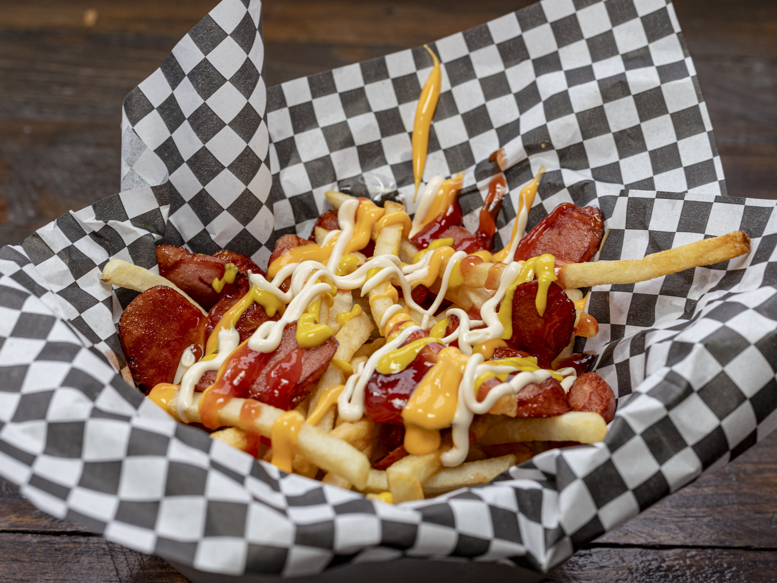 250g de papas a la francesa, salchicha perfectamente cocinada y fileteada, cátsup, mostaza, mayonesa y queso derretido.
