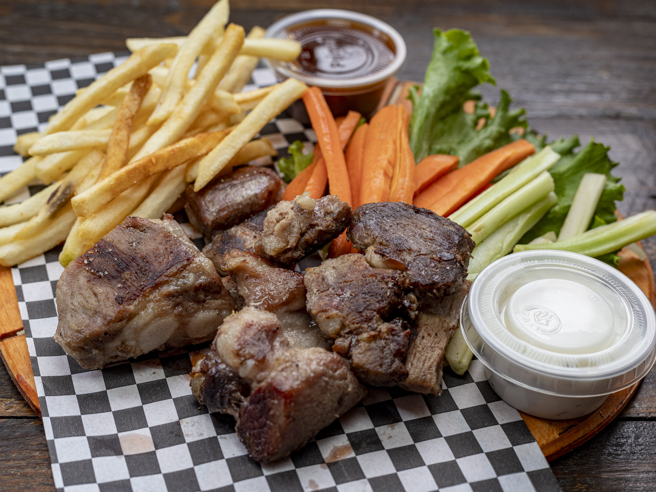 1 Kilo de costilla perfectamente cocinada bañada en tu salsa favorita acompañada de palitos de zanahoria y aderezo ranch para botanear