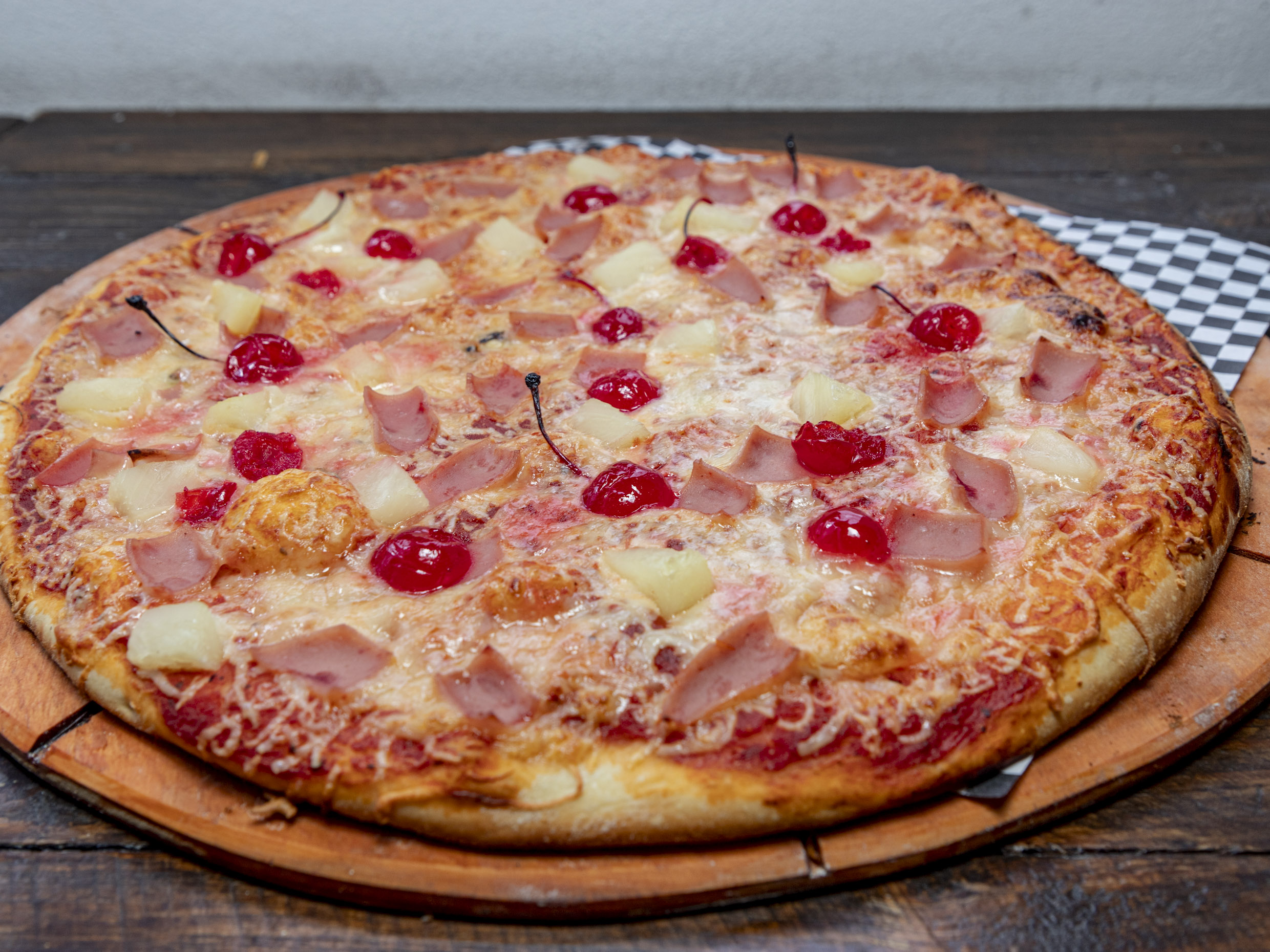 pizza con salsa italiana de la casa, queso mozarella trocitos de piña, jamon y deliciosas cerezas 30cm