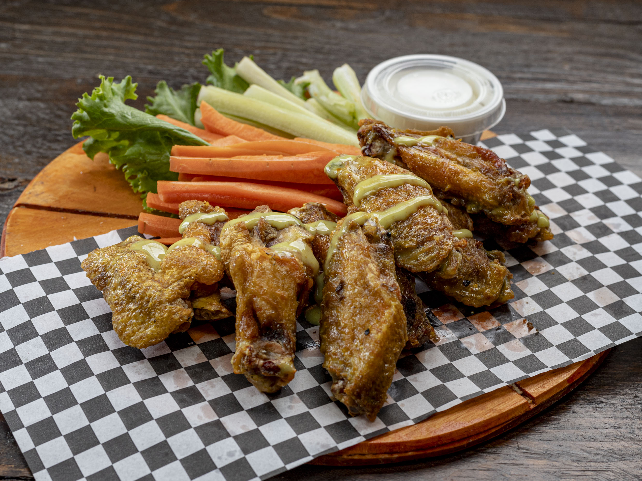 Alitas bañadas en una de nuestras salsas acompañadas de aderezo ranch y palitos de zanahorita para botanear (100% natural peso en crudo)