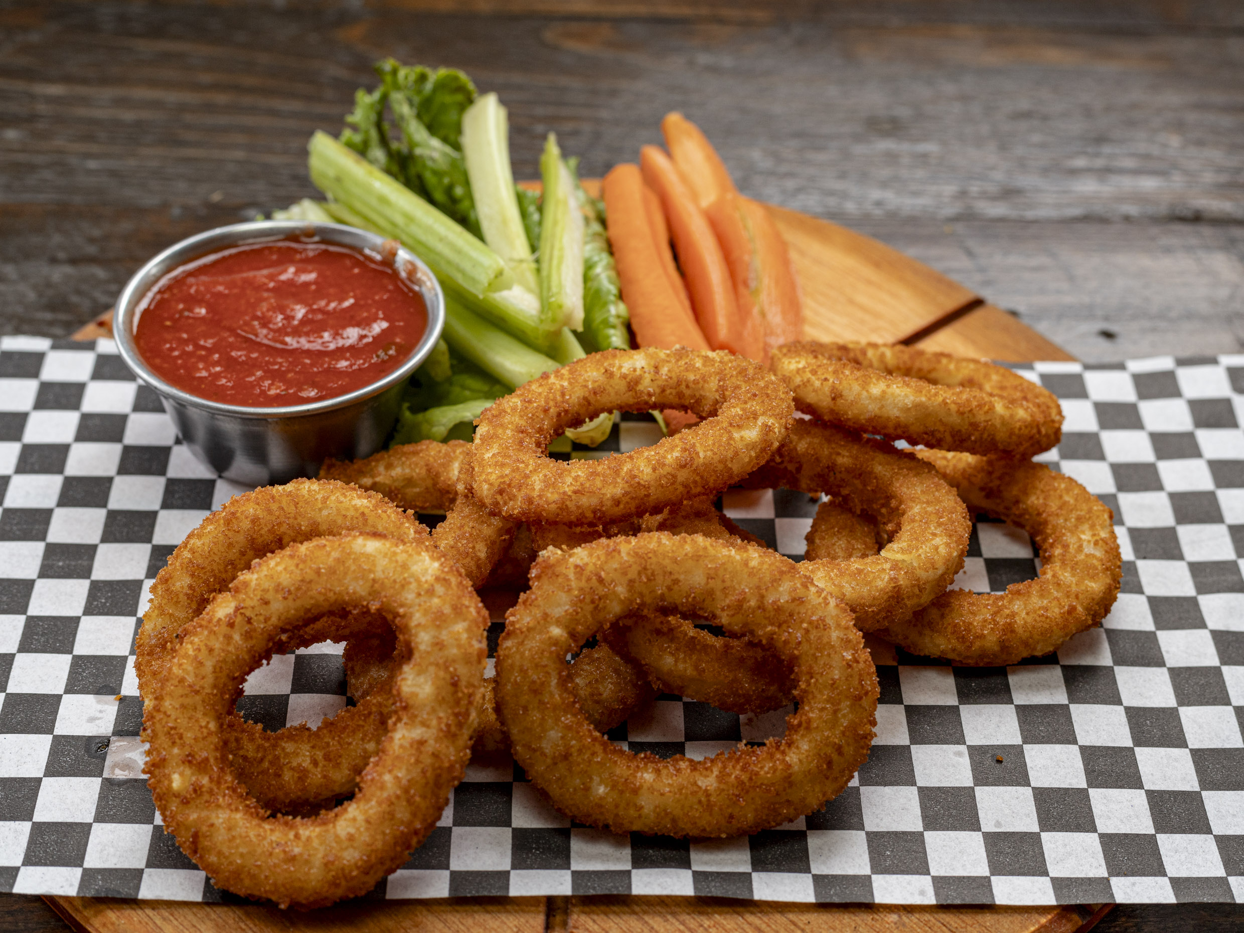 10 Aros de cebolla perfectamente cocinados, cama de lechuga, zanahoria, salsa BBQ y salsa de tomate.