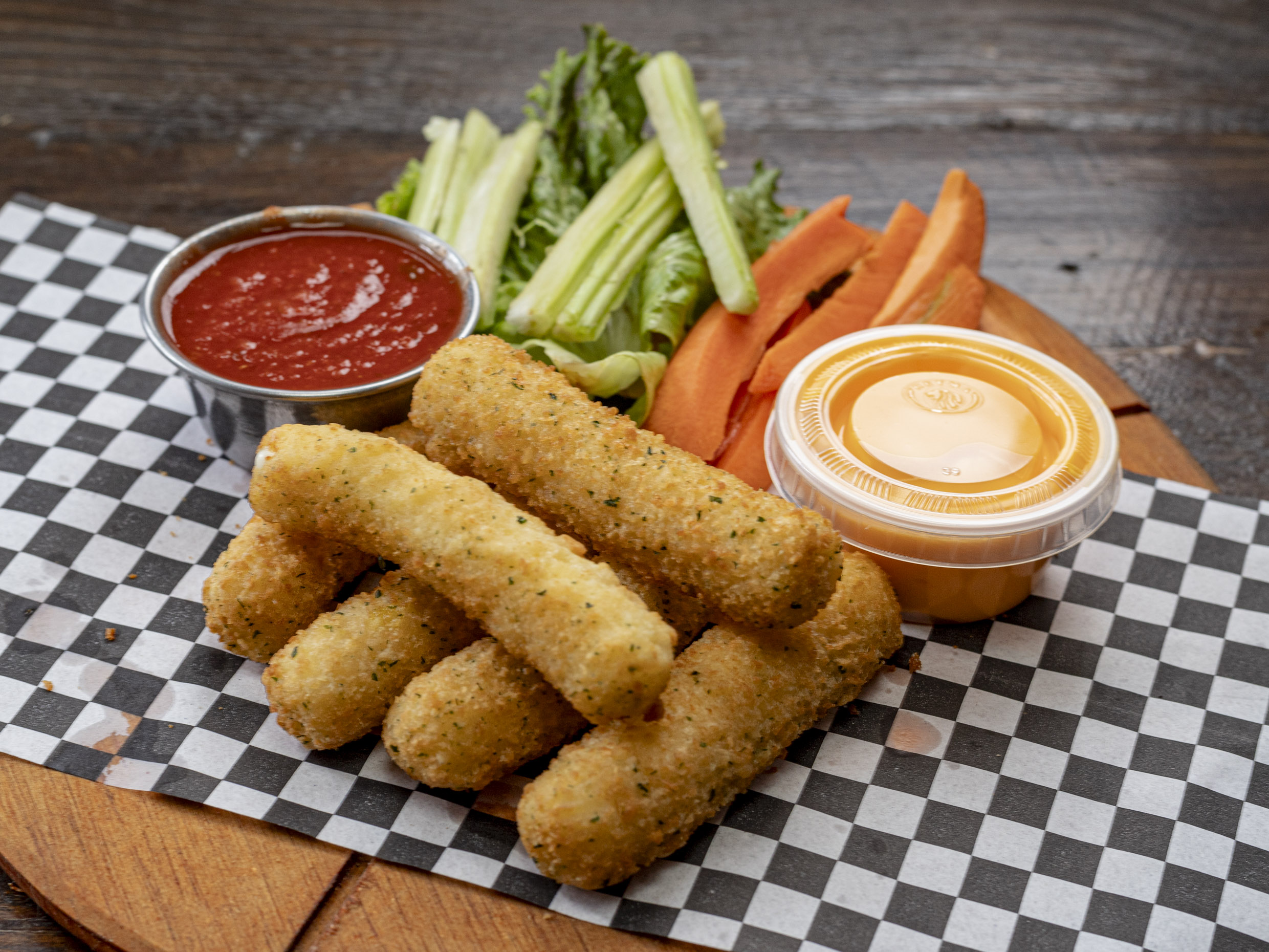 5 de queso perfectamente fritos palitos de zanahoria para botanear Salsa BBQ y Salsa especial de Tomate.