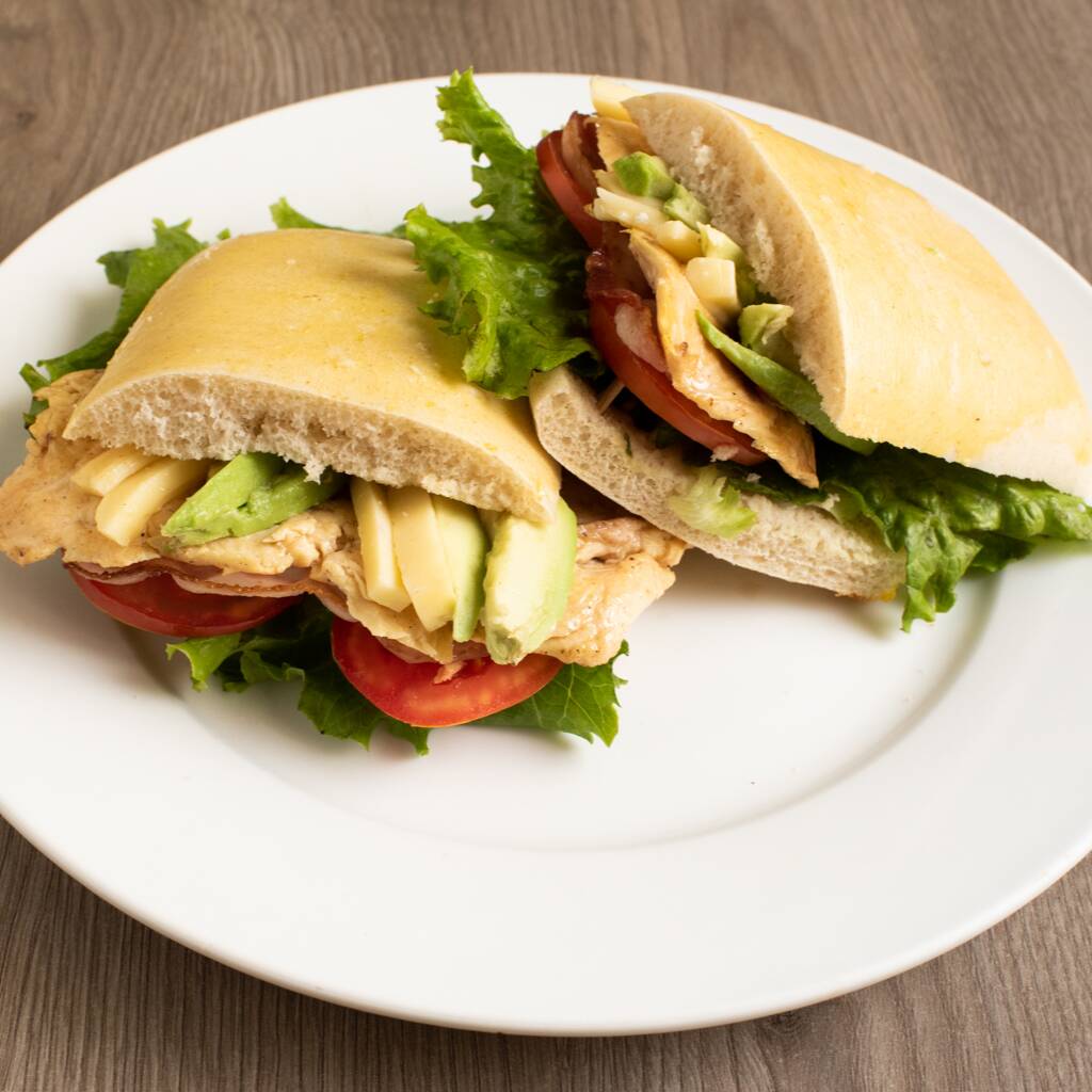 Sándwich de jamón de pechuga de pavo, con aguacate, jitomate, lechuga italiana, queso panela y aderezo chipotle con mayo.