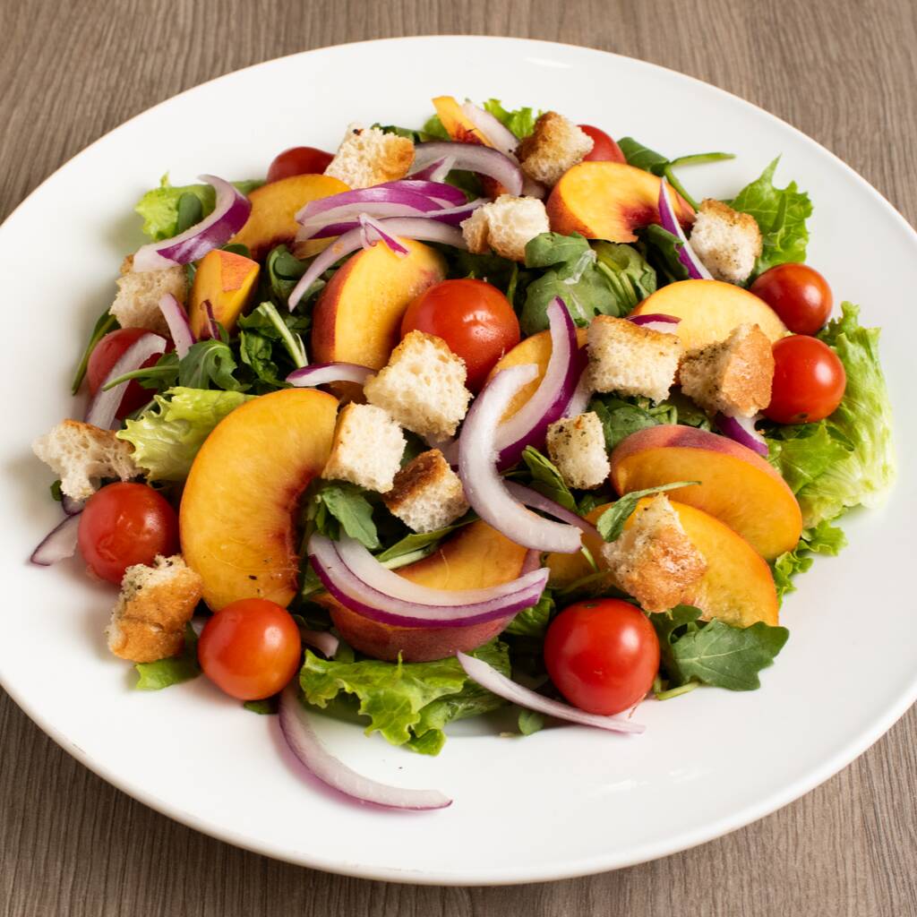 Mix de lechugas, arúgula, tomate cherry, albahaca, cebolla morada, crotones, vinagre balsámico y durazno.