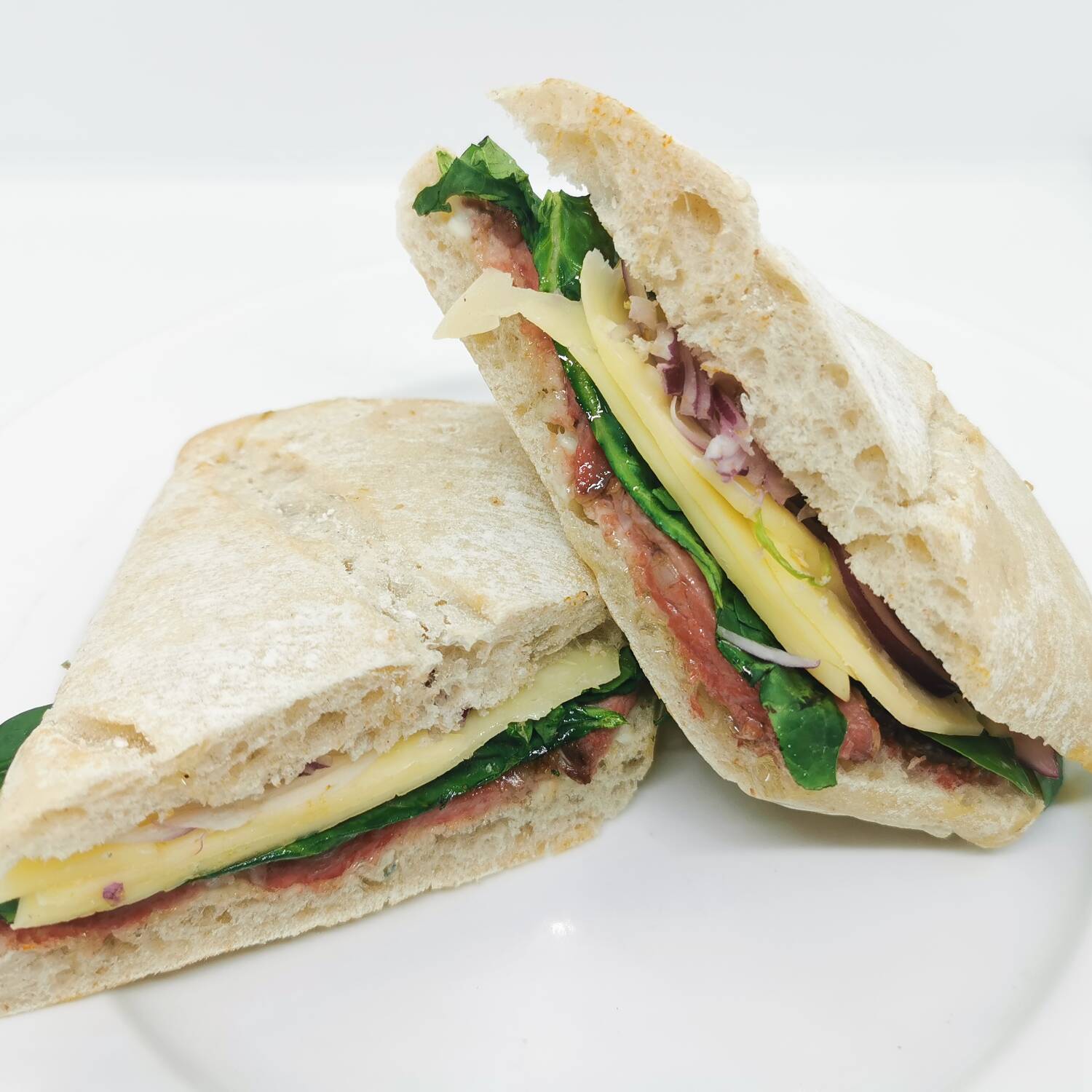 Rostbeef, aderezo blue cheese, manchego, arúgula, cebolla acitronada.