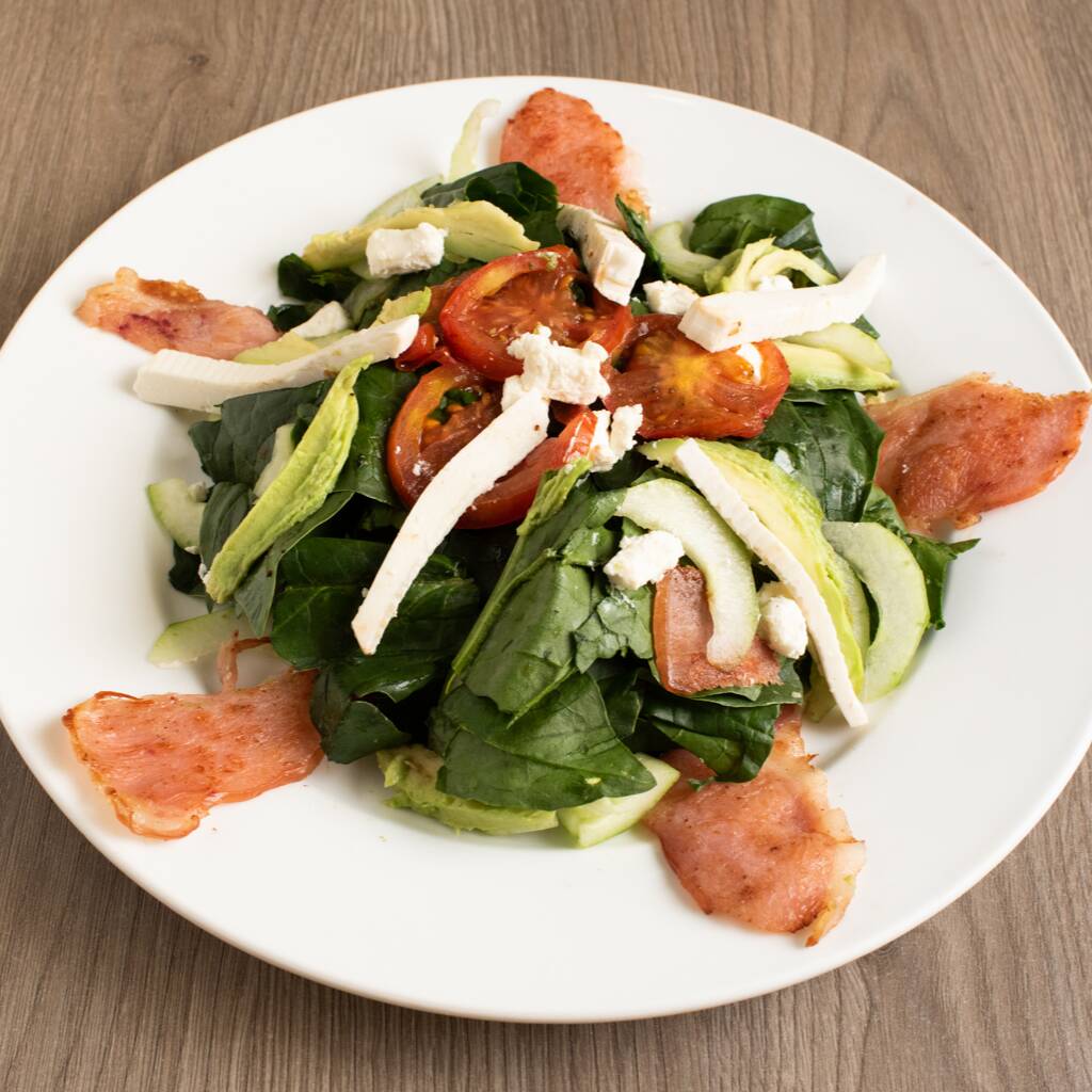 Espinaca, trozos de tocino, jitomate deshidratado, pepino, aguacate, queso gorgonzola, aderezo mostaza.