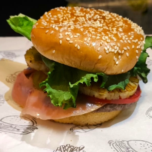Hamburguesa con 90g de carne de res, piña, jamón, queso amarillo, pepinillos, lechuga, cebolla caramelizada, chiles verdes en cuadritos y mayonesa.